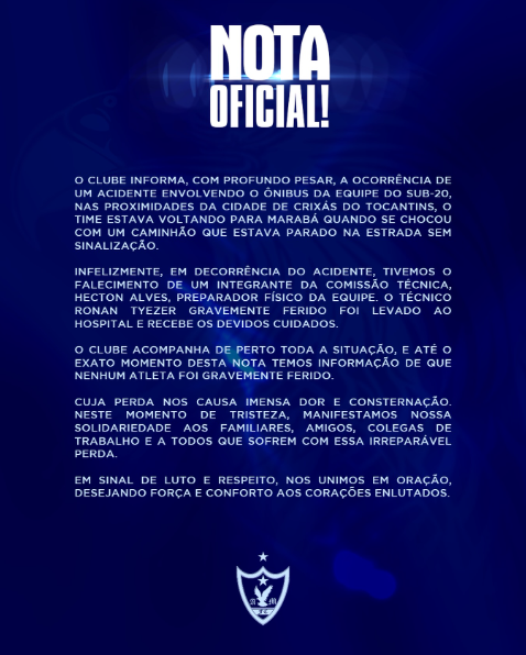 Em nota, o Águia de Marabá manifesta solidariedade aos familiares, amigos e colegas de Hecton Alves, lamentando a perda irreparável. O clube reforça que está acompanhando de perto toda a situação e presta condolências à equipe, aos jogadores e a todos afetados pelo ocorrido.
