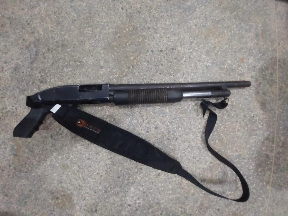 Diante da fundada suspeita, foi realizada uma revista veicular minuciosa, sendo localizados: uma espingarda calibre 12, marca CBC, modelo Pump Military (municiada); uma espingarda calibre 12, marca Mossberg; uma carabina calibre .38, marca Rossi, com acessório de luneta; uma pistola calibre 9mm, marca Taurus, com dois carregadores municiados; uma pistola modelo Glock G45, com dois carregadores municiados; uma pistola calibre 9mm, marca Masada, modelo Wantek, com dois carregadores municiados; 60 munições calibre 12, marca CBC; 50 munições calibre .38, marca CBC; 94 munições calibre 9mm, marca CBC, modelo Orgival Treine; 54 munições calibre 9mm expansivas; 34 munições calibre 9mm, marca CBC, modelo original; dois rádios comunicadores marca Motorola, modelo DP 450, de cor preta; e um coldre velado de KYDEX, cor bege, marca Combat Custom.