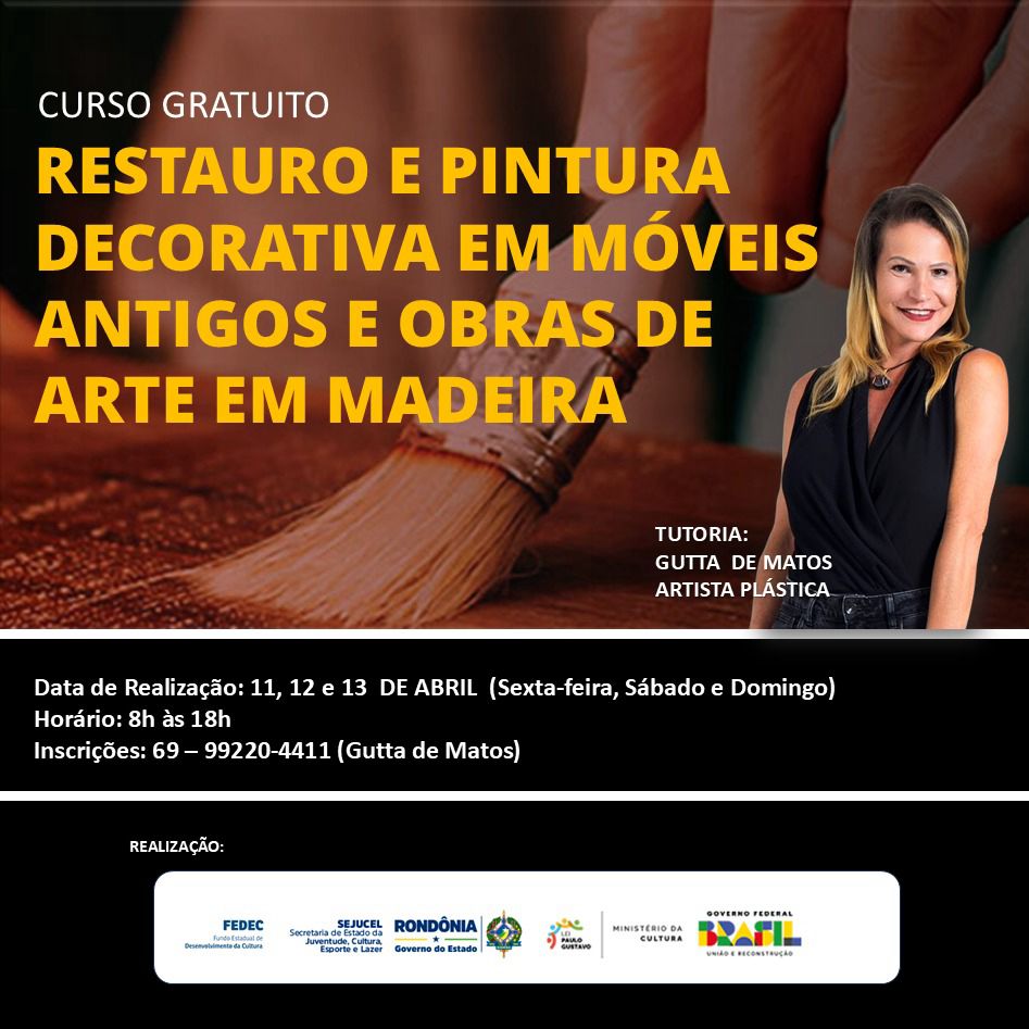 O Curso de RESTAURO E PINTURA DECORATIVA EM MÓVEIS ANTIGOS E OBRAS DE ARTE EM MADEIRA é financiado pelo Governo Federal através da Lei Paulo Gustavo com apoio da Governo de Rondônia através da SEJUCEL e FEDEC.