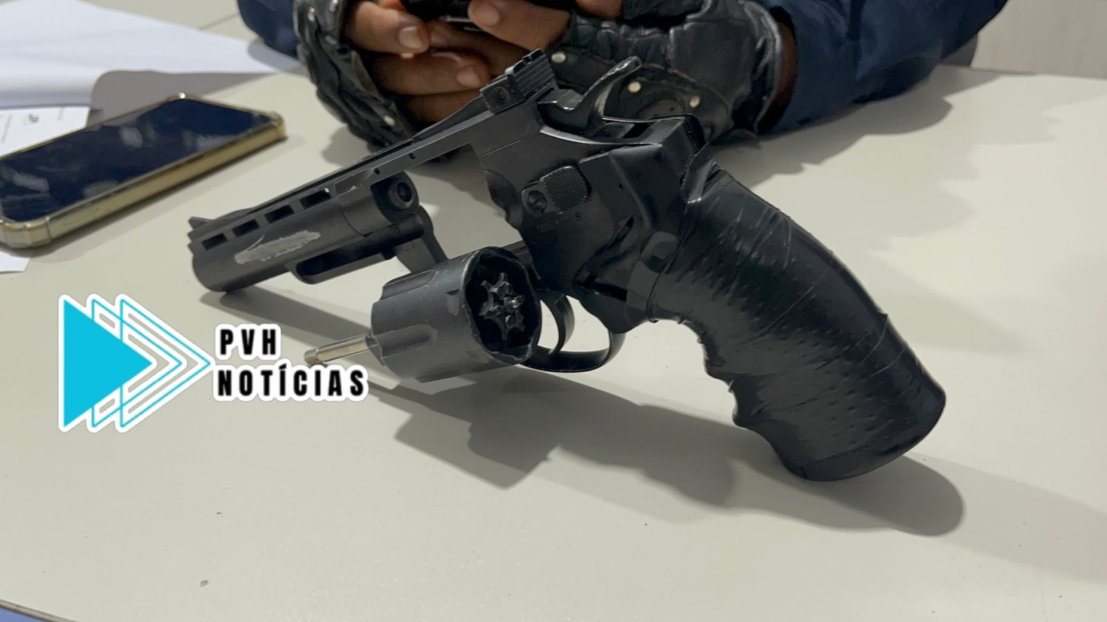 Com ele foi apreendido um simulacro de revólver, o celular iPhone e uma moto Honda Biz roubados, além das roupas usadas durante os roubos. O criminoso também estava com mandado de prisão em aberto.