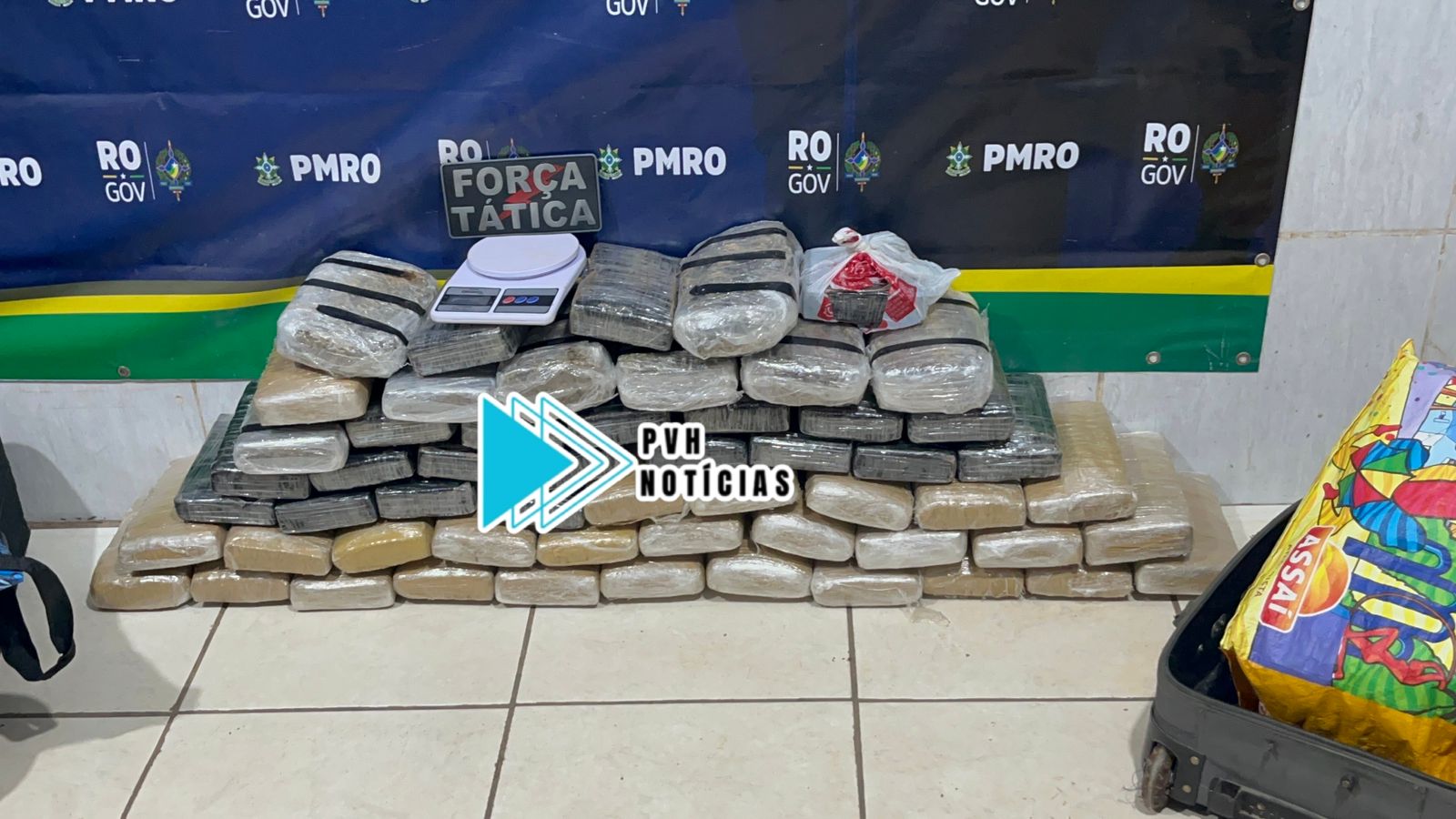Durante as buscas o suspeito foi localizado e tentou fugir entrando em uma residência, mas foi cercado e preso. Com ele foram encontrados dois tabletes de drogas, e no quarto dele uma mala e um saco, com diversos outros tijolos de entorpecentes, pesando 57kg.