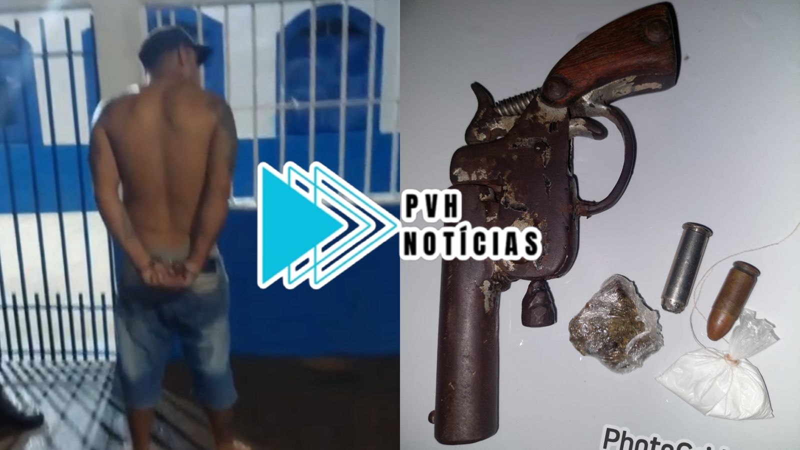 Na cintura foi encontrada uma arma de fabricação caseira com duas munições, uma calibre.38 e outra 9mm, além de uma porção de maconha e outra de cocaína.