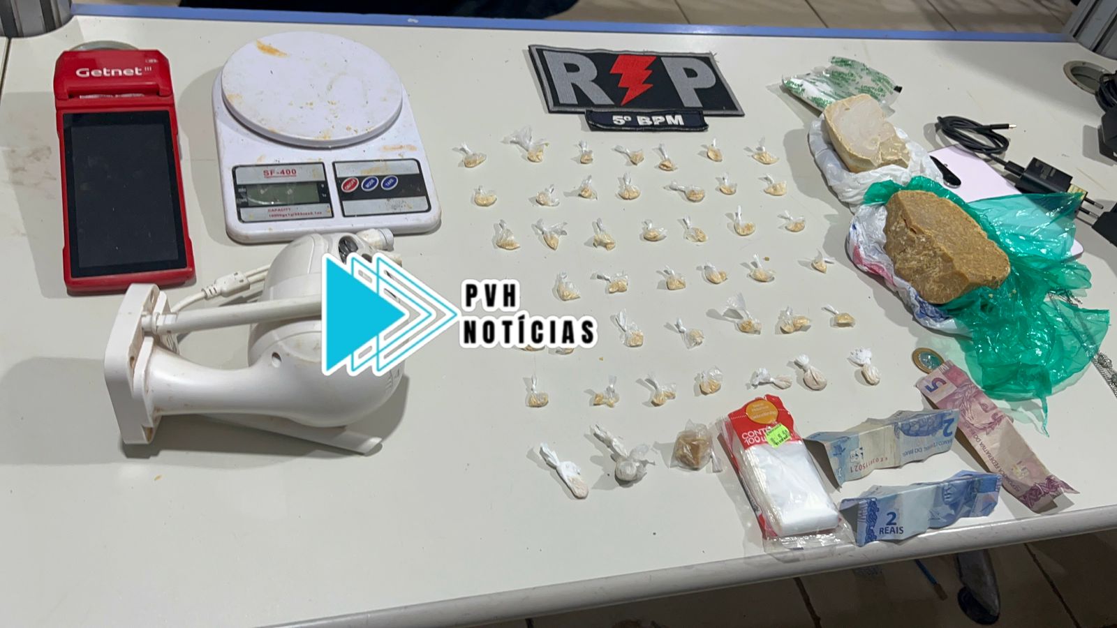 Foram apreendidos ainda câmera de monitoramento, máquina de cartão, balança de precisão e material usado no tráfico de drogas. Foi constatado também que o apenado estava com a tornozeleira eletrônica desligada.