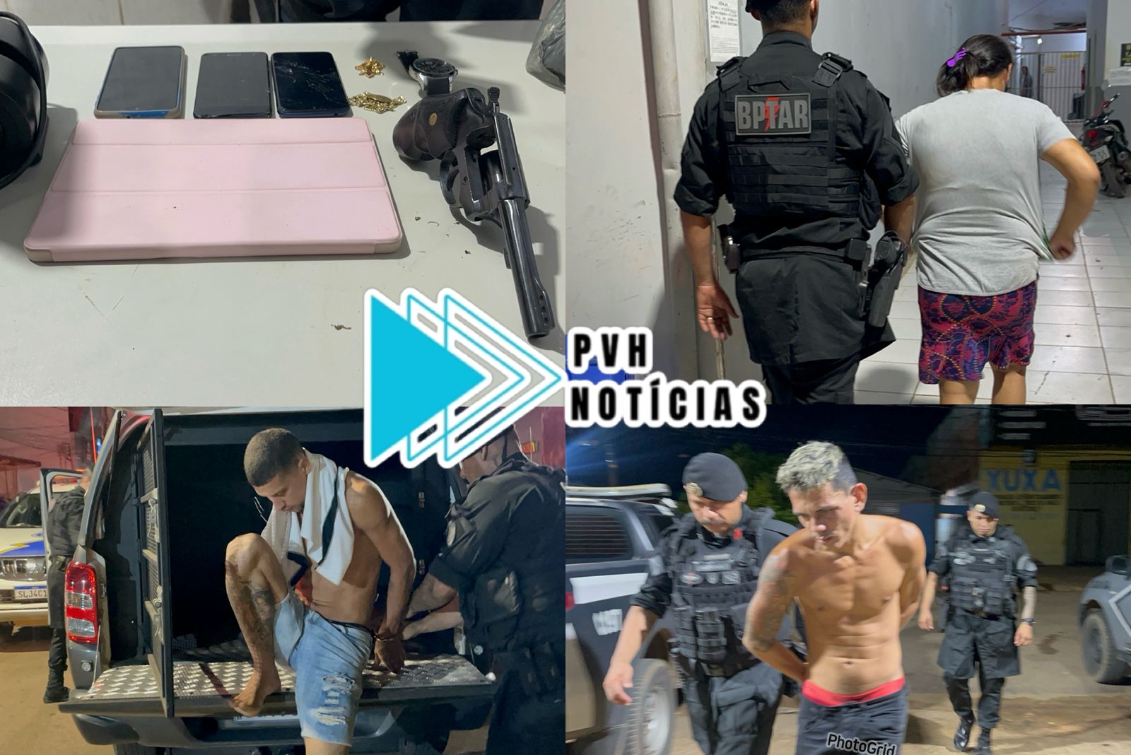 Um revólver calibre 38, e os objetos roubados foram recuperados. Uma mulher de 51 anos também acabou presa por ajudar o foragido a esconder a arma na casa dela. Todos foram encaminhados ao Departamento de Flagrantes.