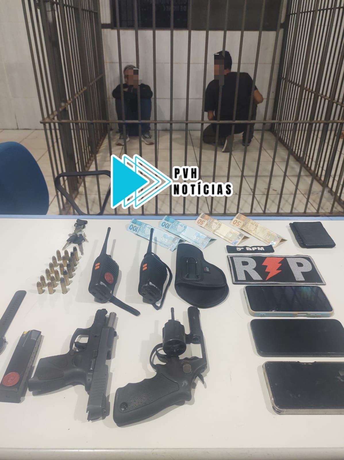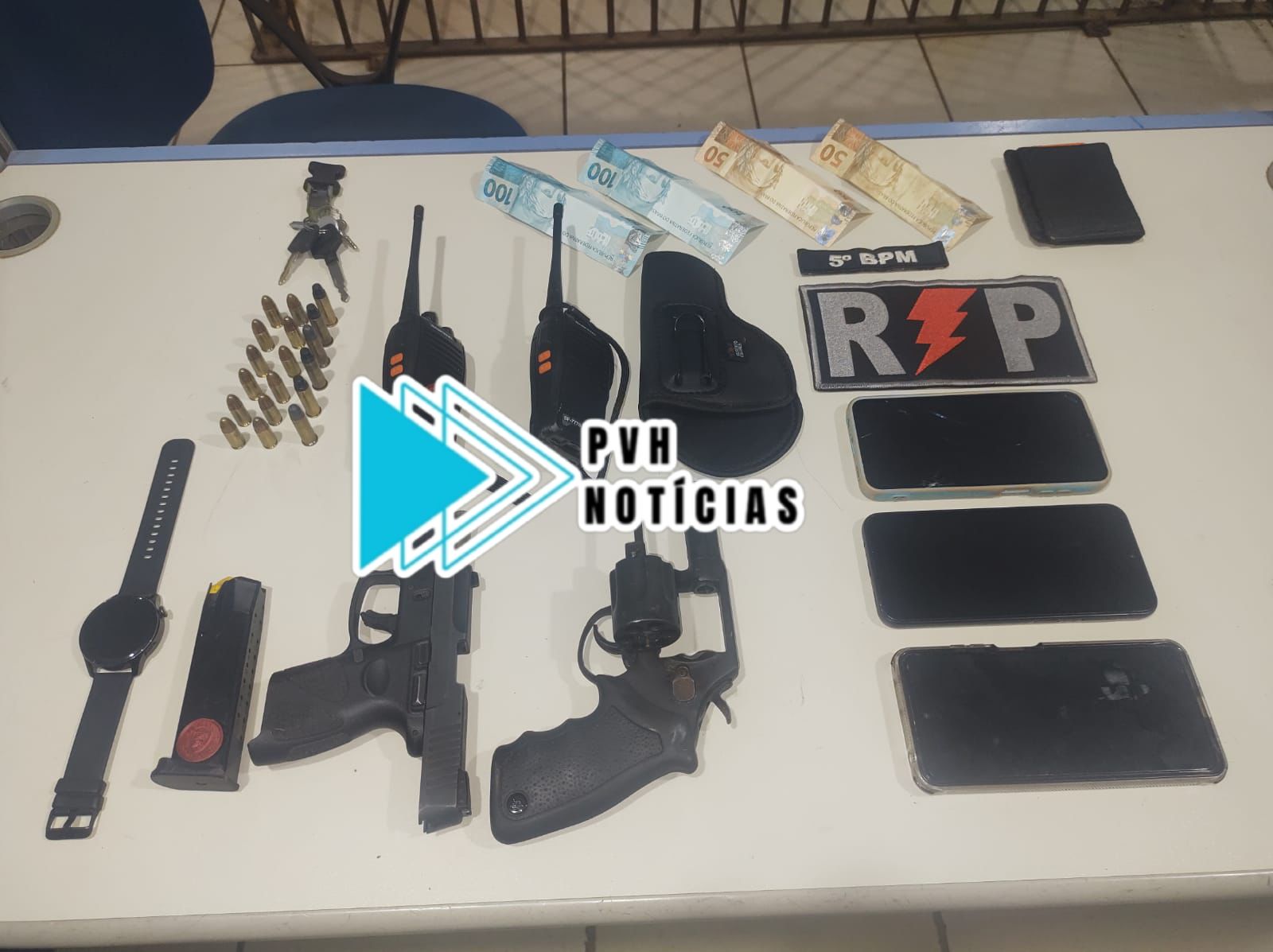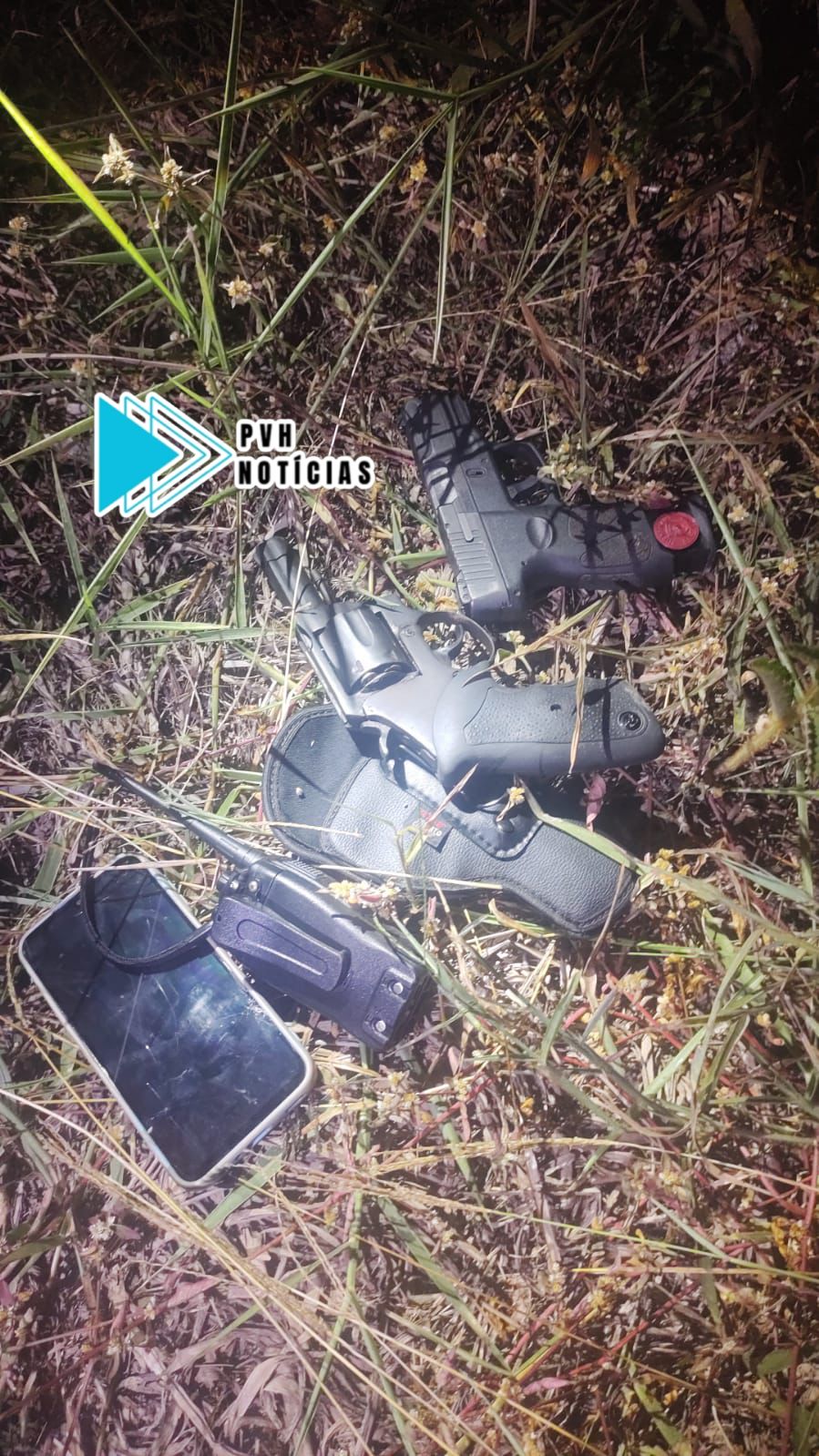 Durante buscas nos fundos da casa foram encontrados dois capacetes, duas armas, sendo um revólver e uma pistola, além de duas motos e dois rádios comunicadores.