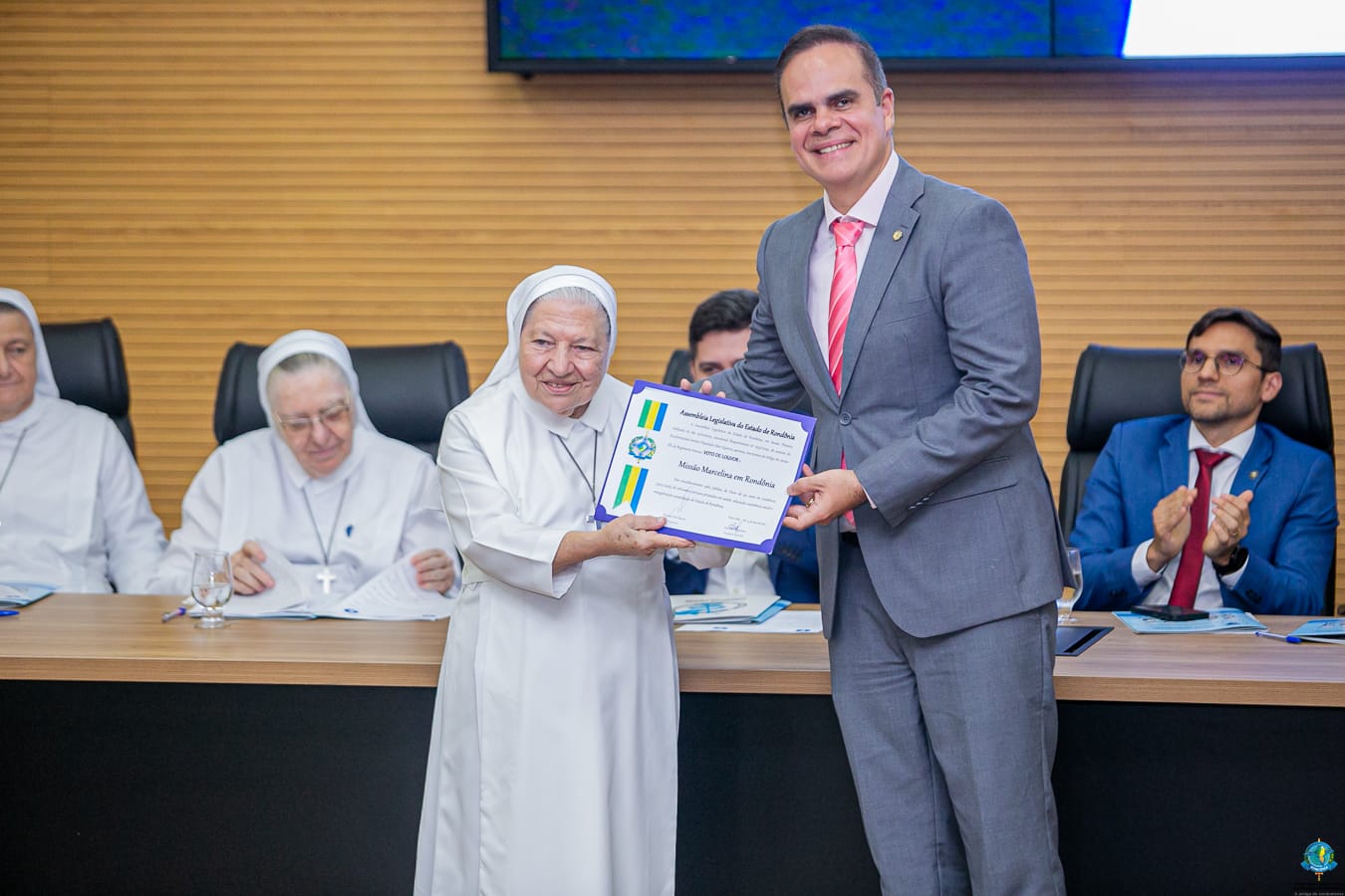 Na última quarta-feira (14), a Assembleia Legislativa de Rondônia foi palco de duas homenagens. Promovidas pelo deputado estadual Alan Queiroz (Podemos), foi realizada uma Sessão Solene em homenagem a Nossa Senhora Auxiliadora, padroeira de Porto Velho e uma Sessão Solene em homenagem aos 50 anos da Missão Marcelina em Rondônia. A iniciativa do parlamentar visa reconhecer a importância tanto da padroeira da capital, quanto da missão das Irmãs Marcelinas na área da saúde, educação, assistência social e evangelização.