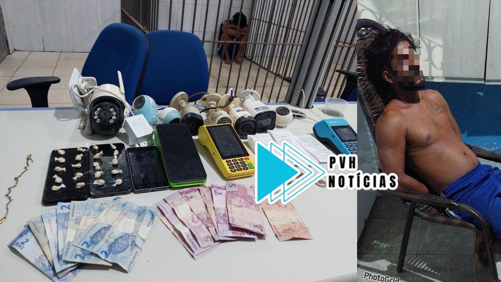 Durante a varredura foram apreendidas diversas câmeras, TVs, porções de crack, máquinas de cartão e dinheiro, que foram encaminhadas ao Departamento de Flagrantes com o suspeito preso.
