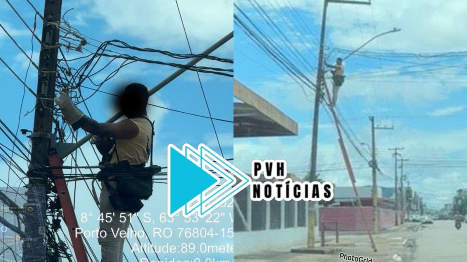 Um homem não identificado foi flagrado em cima de um poste de iluminação pública, realizando uma ligação clandestina de energia.
