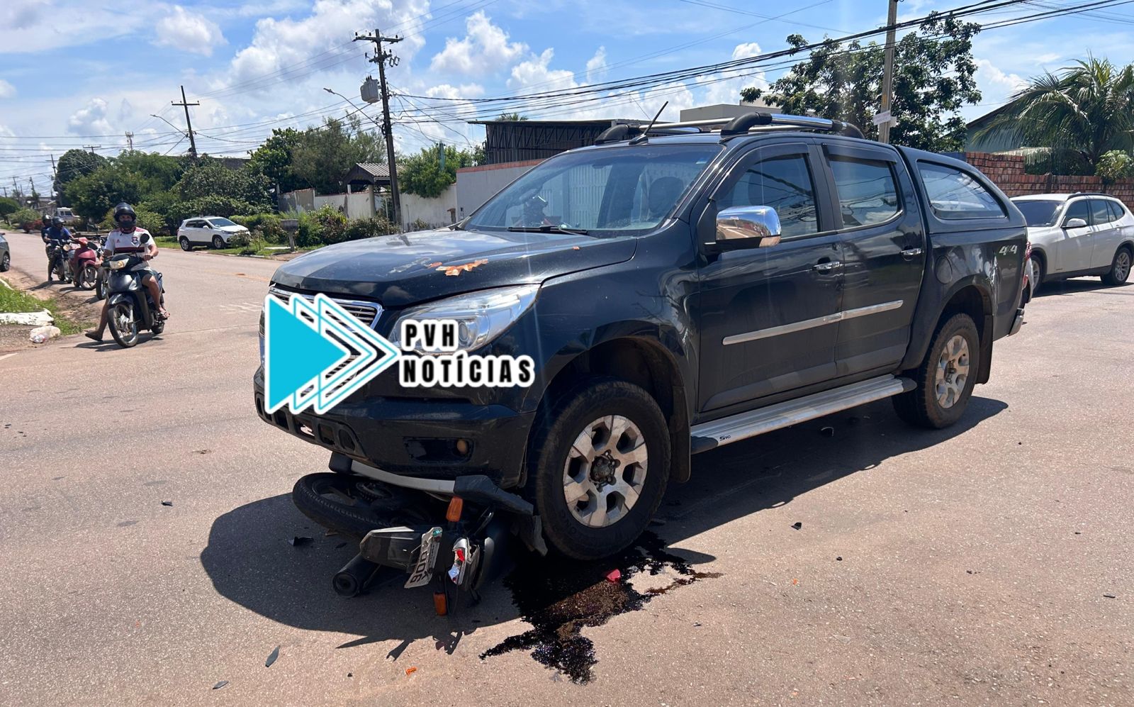 O vídeo mostra quando a moto bate no Mobi, em seguida cai na frente da caminhonete e chega a ser arrastada pelo veículo.