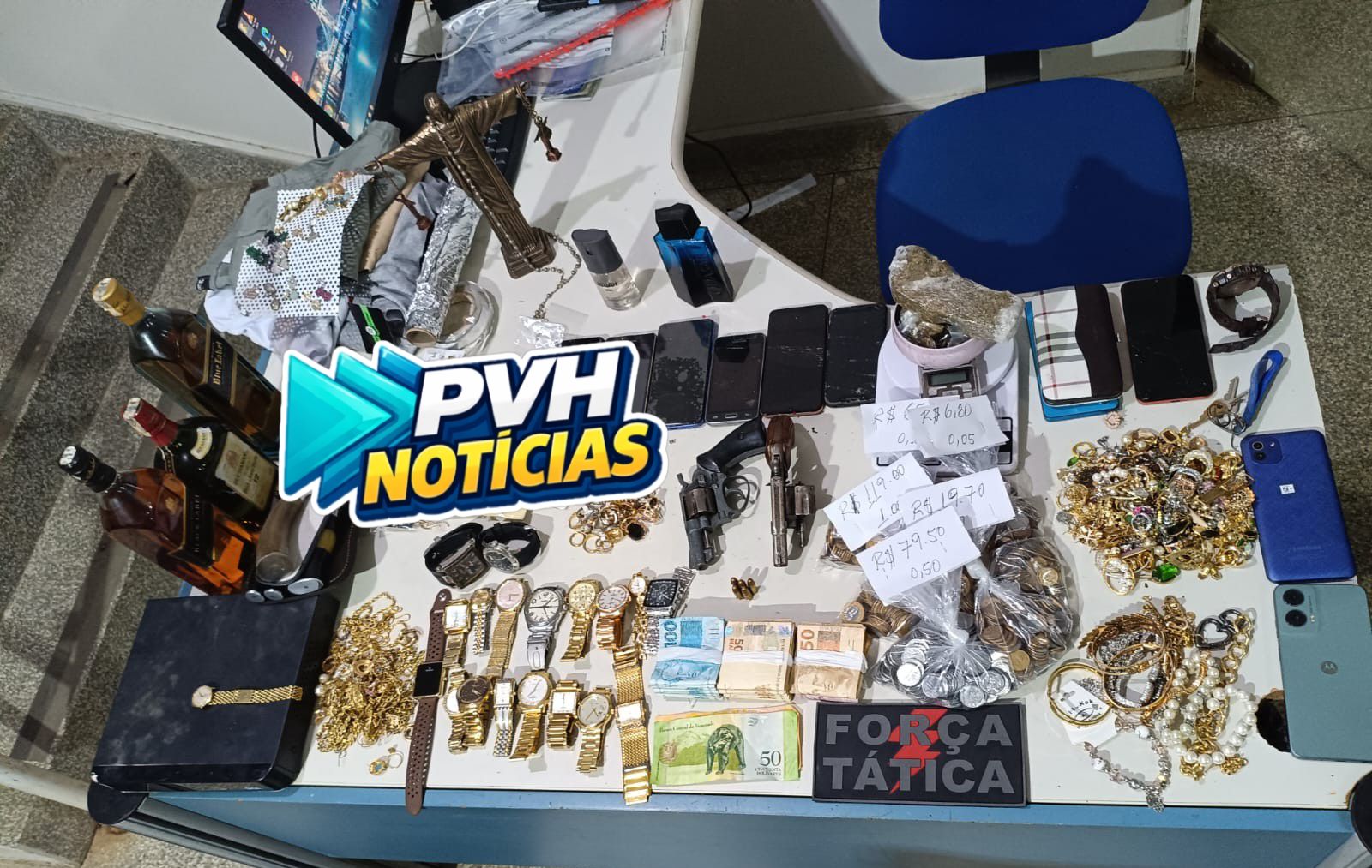 Duas armas e vários objetos roubados na casa do empresário foram apreendidos e apresentados na delegacia de Ariquemes.