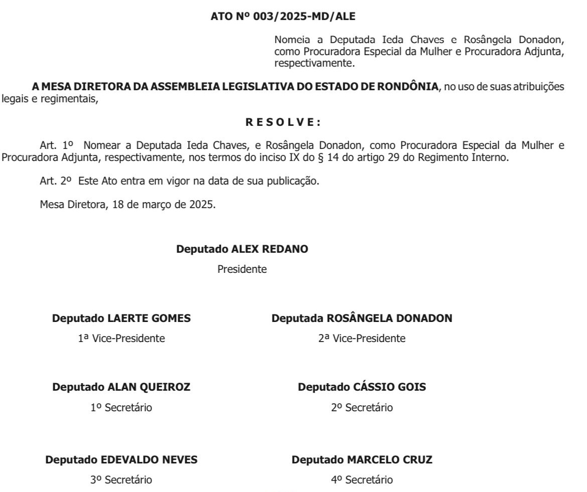 A deputada estadual Ieda Chaves (União Brasil) foi nomeada, há alguns dias, presidente da Procuradoria Especial da Mulher (PEM). Com essa notícia, está garantida a adoção de providências para a retomada das atividades pelo Centro Humanizado de Atendimento à Mulher do Estado de Rondônia (Chameron). A PEM busca manter a defesa dos direitos do público feminino, após a publicação do ATO Nº 003/2025-MD/ALE, assinado pelo presidente da Assembleia Legislativa (Alero), Alex Redano (Republicanos).