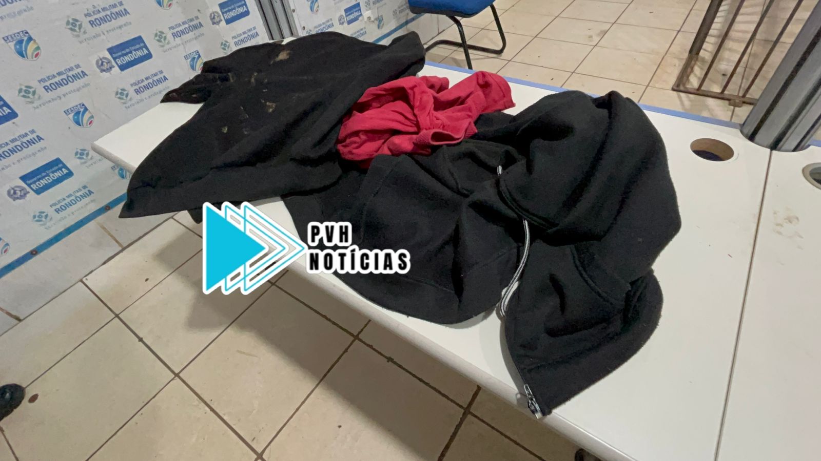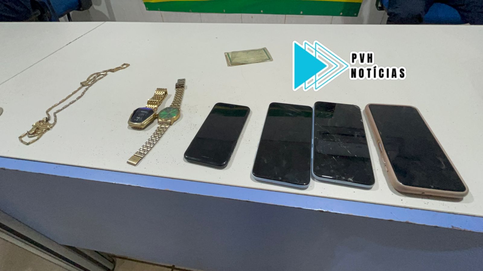 Após receber denúncias do paradeiro dos suspeitos, a PM fez o cerco no local e abordou a dupla. Com eles foram encontradas as roupas usadas durante o roubo, quatro celulares, cordão de ouro, e relógios de procedência duvidosa.