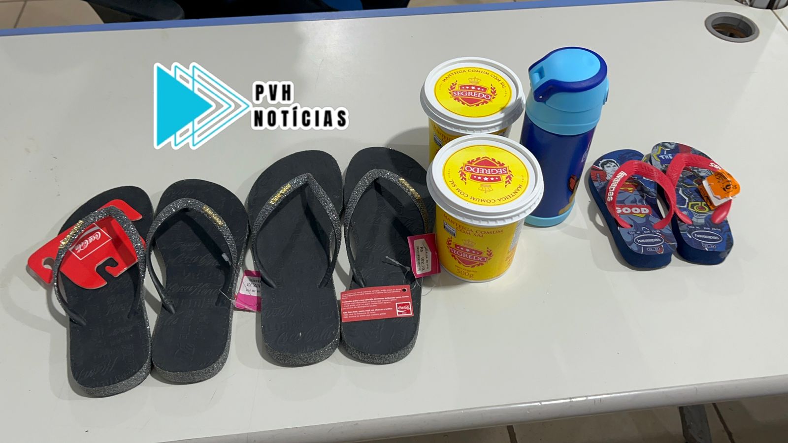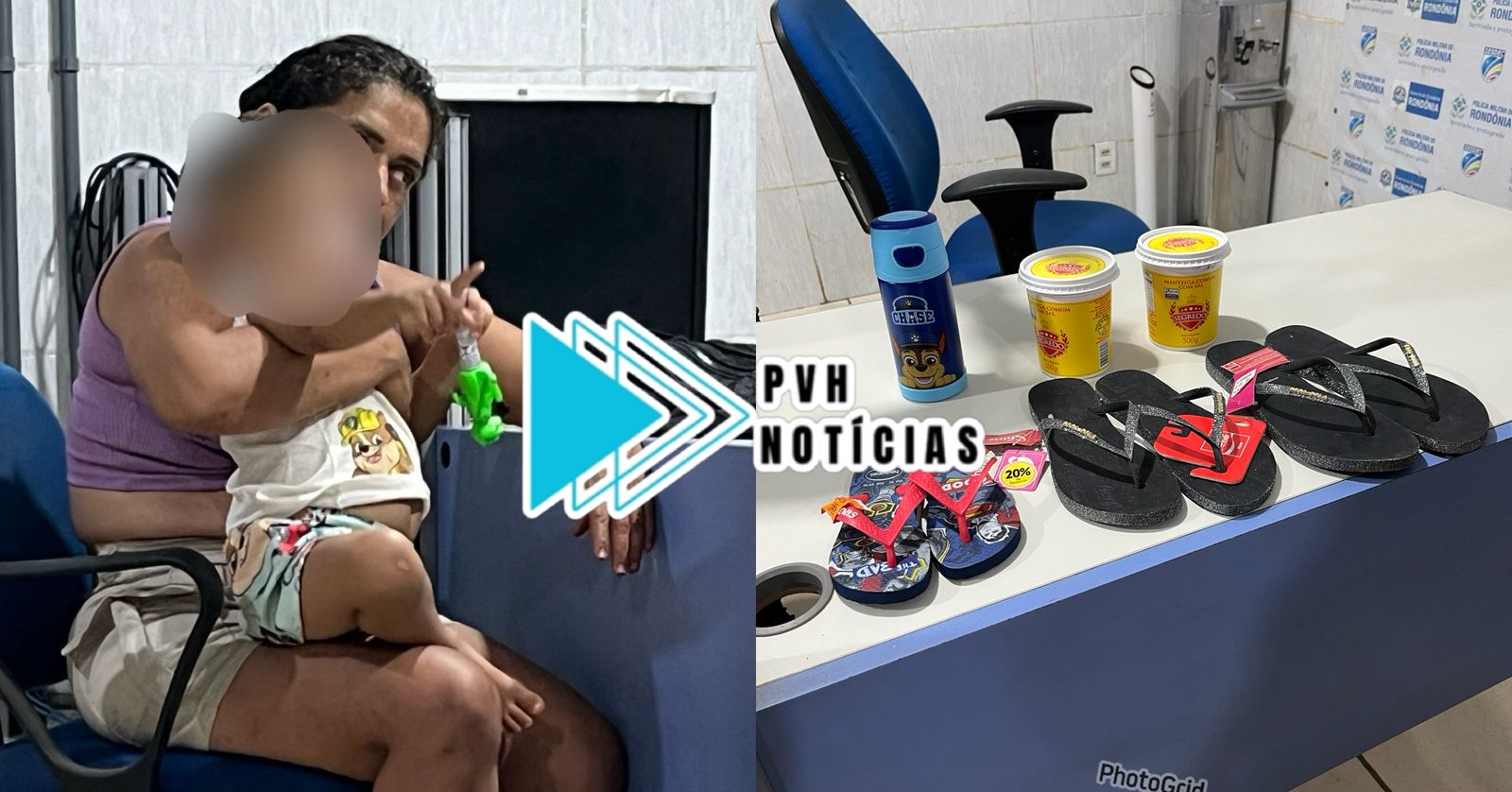 A PM foi chamada e encontrou com a mulher 3 pares de sandálias, dois potes de manteiga e uma garrafa térmica infantil. Na delegacia a criança dizia chorando “mamãe não me deixa”, depois foi entregue para familiares.
