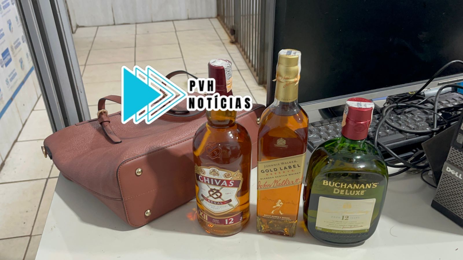 De acordo com a PM, a suspeita usava uma bolsa feminina quando colocou três garrafas de whisky, sendo Chivas, Johnnie Walker e Buchanan’s de Luxe.