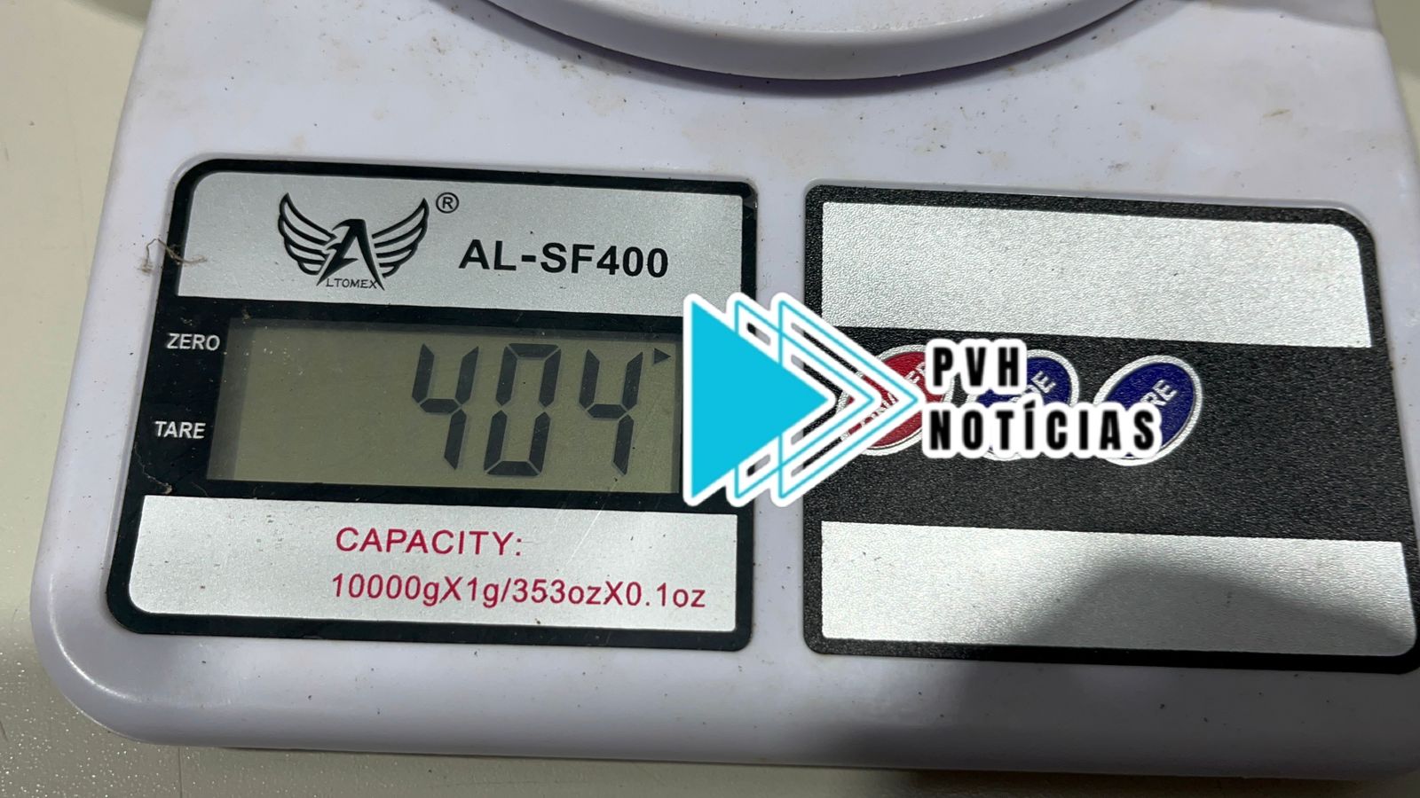 Durante as buscas dupla suspeita foi localizada em uma moto Honda de cor preta, e logo foram abordados. Na revista foi encontrado na cueca do passageiro, um tablete pesando 404g, que seria levado para o distrito de Triunfo.