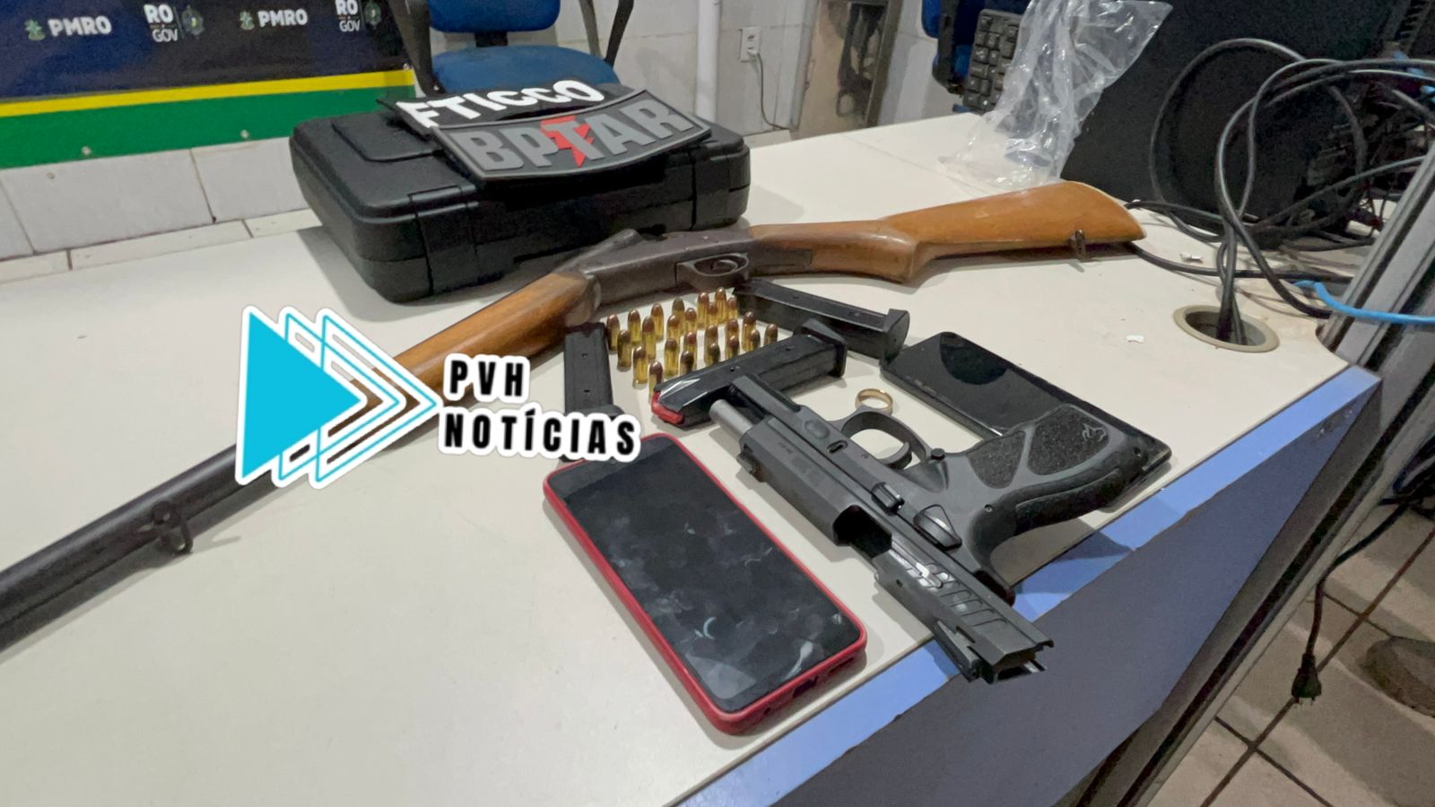 O criminoso que possui passagem por tráfico, confessor ter outra arma em casa, onde foi encontrada uma espingarda com numeração raspada, calibre 20 com uma munição. Ambos foram encaminhados ao Departamento de Flagrantes.