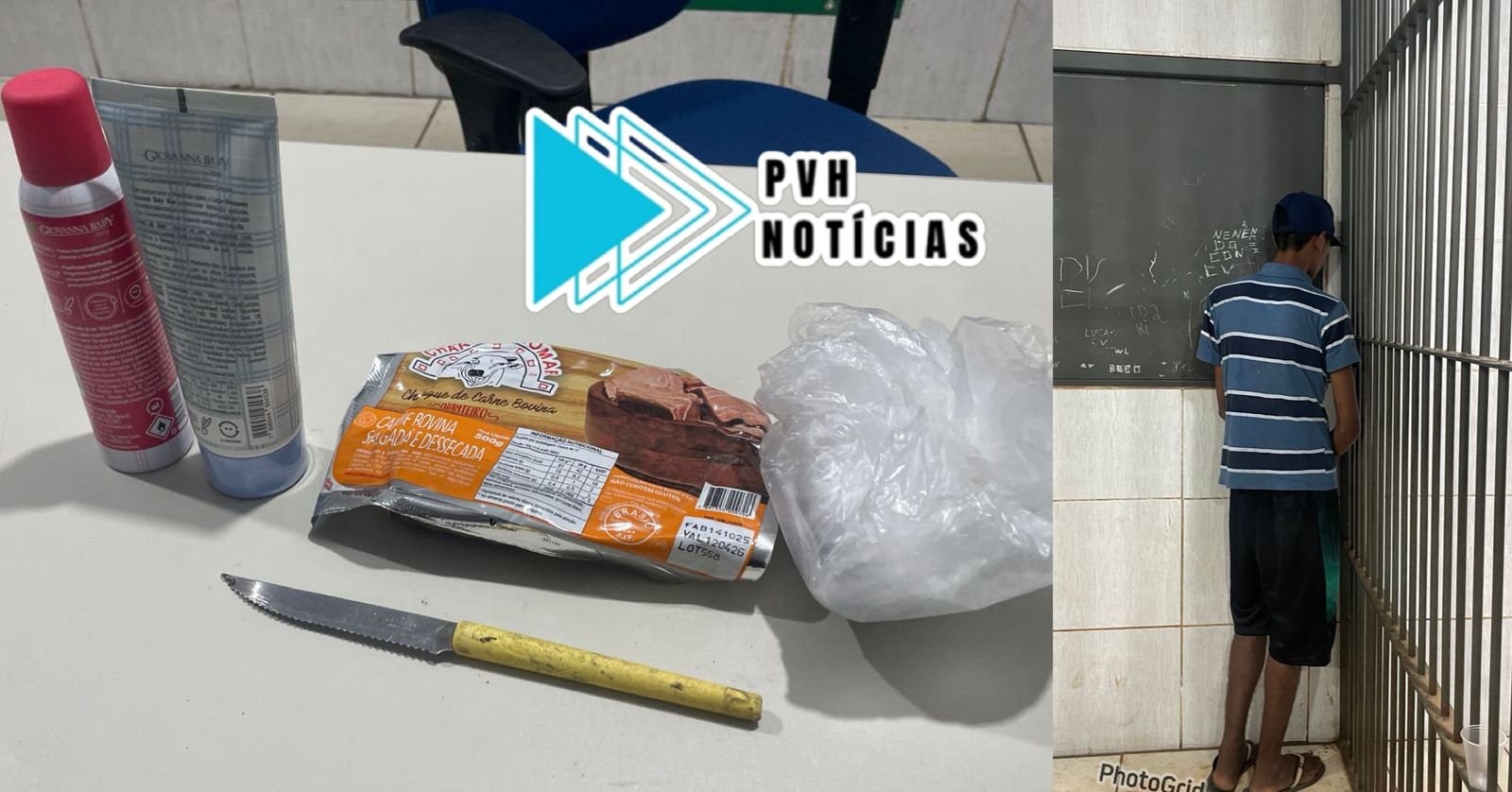 Segundo a PM, o suspeito foi visto pelas câmeras de segurança quando pegou alguns produtos e depois tentou sair sem pagar, mas foi impedido. Com ele foram encontrados um pacote de charque, desodorante e hidratante.
