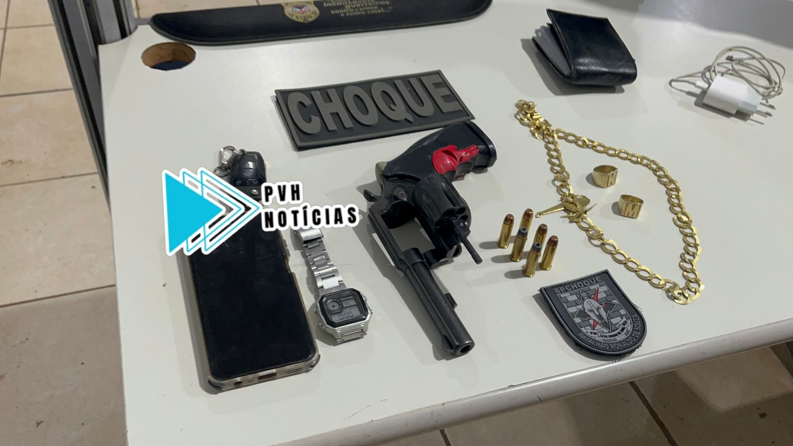 Na revista do veículo foi encontrado um revólver calibre 38 municiado, e na pesquisa nominal, constatado um mandado de prisão em desfavor de Kauan. Ambos foram conduzidos ao Departamento de Flagrantes.