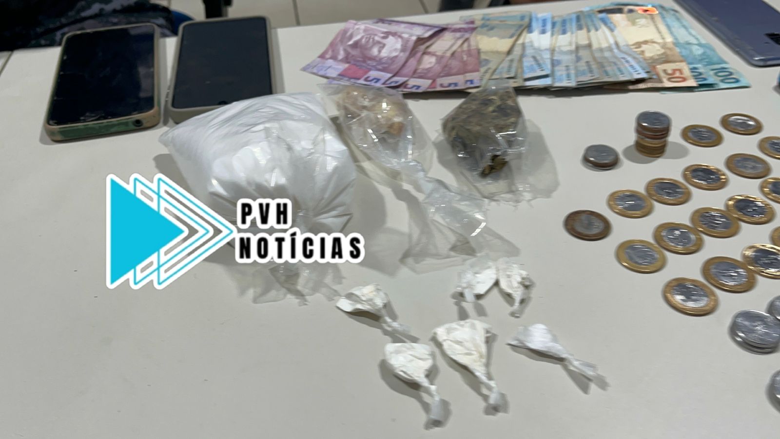 Na chegada os policiais conseguiram fazer a abordagem aos três suspeitos, e na revista pessoal e no imóvel, foram encontradas porções de maconha, cocaína eu crack, além de dinheiro, máquina de cartão e material usado para embalar os entorpecentes.