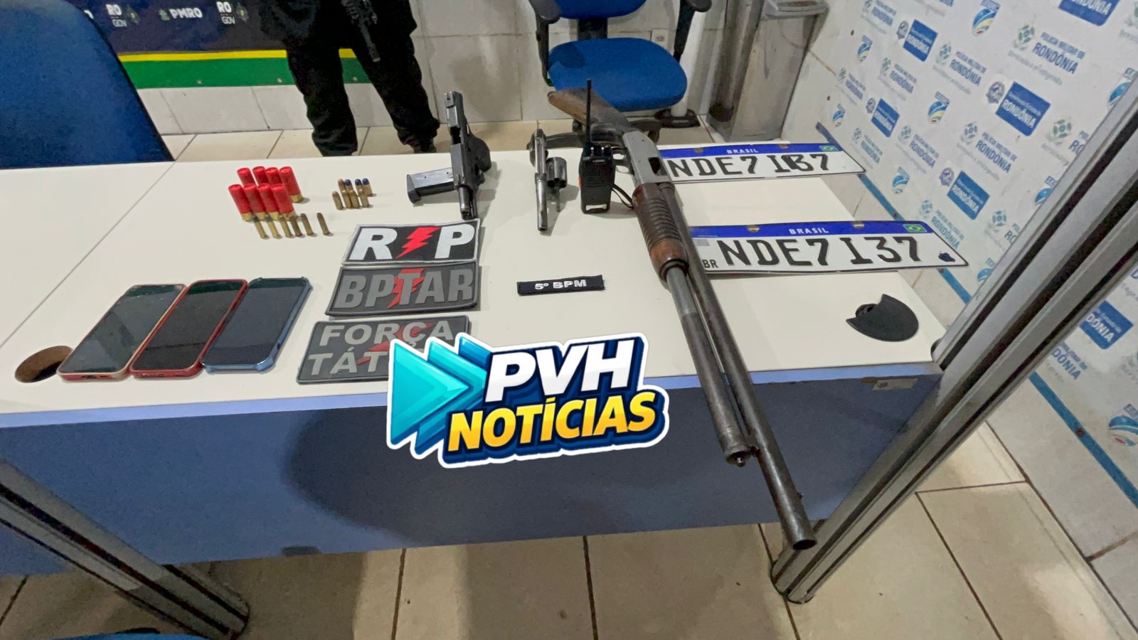 Com eles foram apreendidas duas placas adulteradas com fita isolante, celulares, uma espingarda calibre 12, uma pistola calibre .45 com numeração raspada e diversas munições.