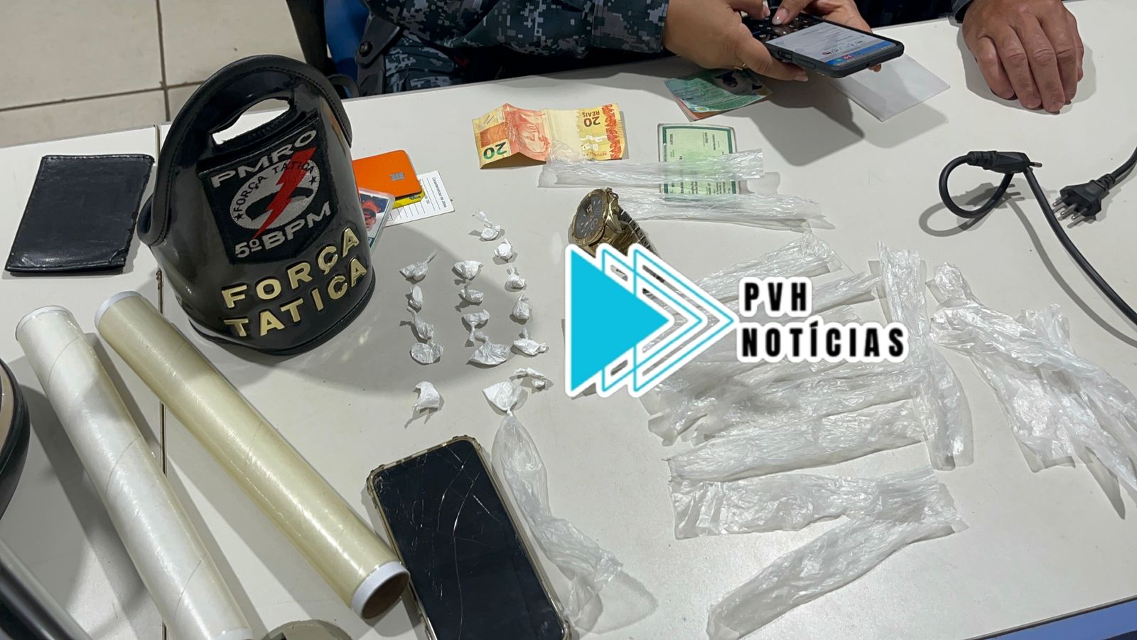 Depois de um breve acompanhamento o suspeito foi abordado na Rua Fábia. Durante revista foi encontrado com o suspeito, várias porções de cocaína e sacos plásticos para embalar os entorpecentes. A adolescente que estava junto foi liberada.
