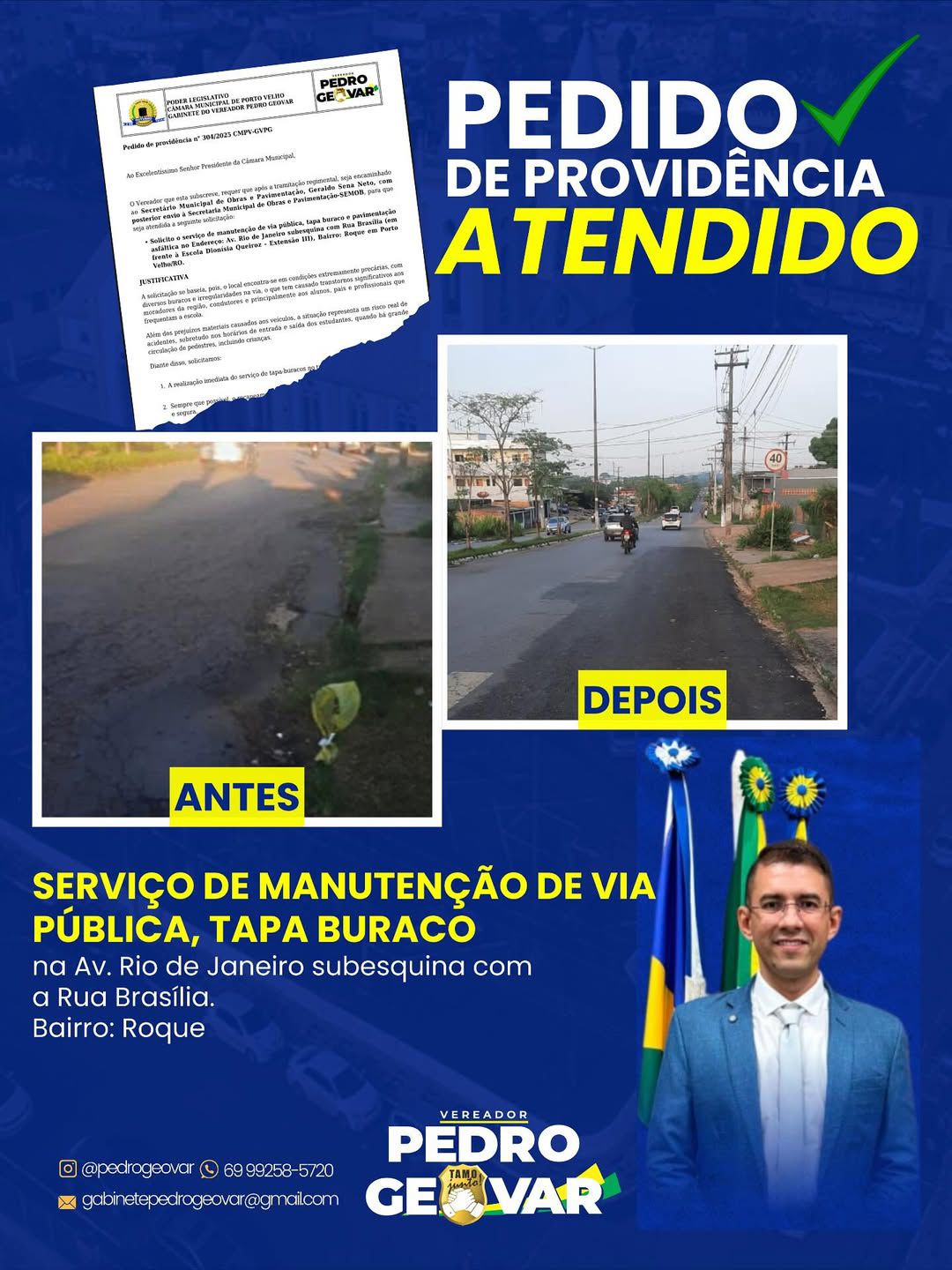 A atuação do vereador Pedro Geovar (PP) resultou em mais uma conquista para a população de Porto Velho. O Pedido de Providência nº 304/2025, de autoria do parlamentar, foi atendido pela Prefeitura, garantindo obras de manutenção viária no bairro Roque.