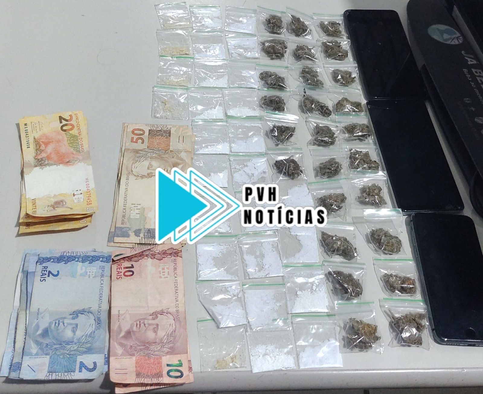 Foram apreendidas mais de 50 porções de entorpecentes entre maconha, cocaína e crack, além de R$360 reais e vários celulares de procedência duvidosa.