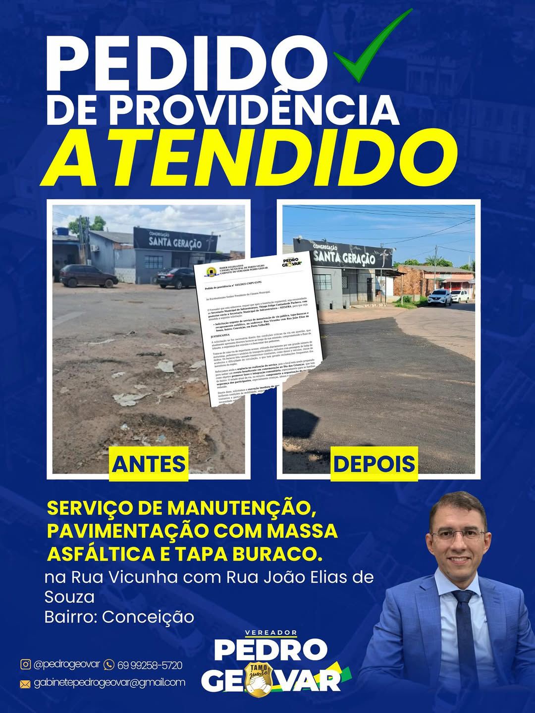 A Prefeitura de Porto Velho realizou serviços de recuperação viária no bairro Conceição, atendendo ao Pedido de Providência nº 443/2025, protocolado pelo vereador Pedro Geovar (PP).