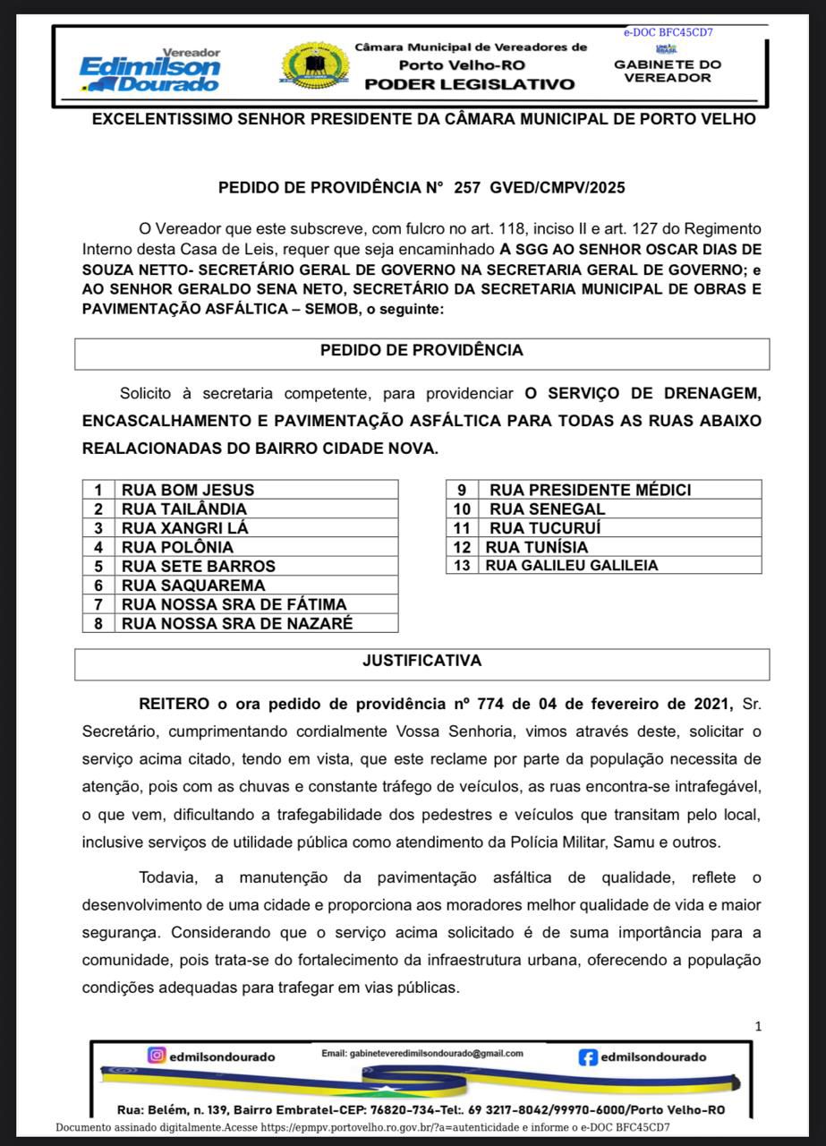 Dourado também agradeceu ao prefeito Léo Moraes pelo atendimento da demanda. “Temos contado com o apoio do prefeito, que tem dado atenção às nossas indicações e priorizado obras importantes para os bairros da nossa cidade”, concluiu.
