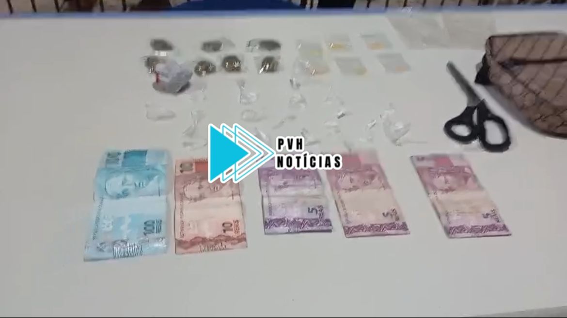 Durante varredura os policiais encontraram dois celulares roubados, 8 porções de maconha, 6 de crack e 17 de cocaína, dinheiro do tráfico e objetos de procedência duvidosa.