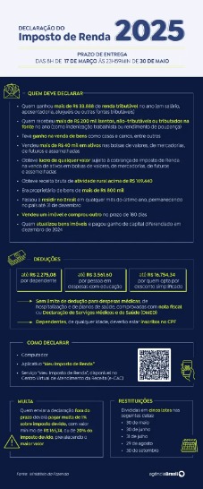 As pessoas físicas que receberam rendimentos tributáveis acima de R$ 33.888, assim como aquelas que obtiveram receita bruta da atividade rural acima de R$ 169.440, são obrigadas a declarar. As pessoas que receberam até dois salários mínimos mensais durante 2024 estão dispensadas de fazer a declaração, salvo se se enquadrarem em outro critério de obrigatoriedade (veja na figura abaixo).