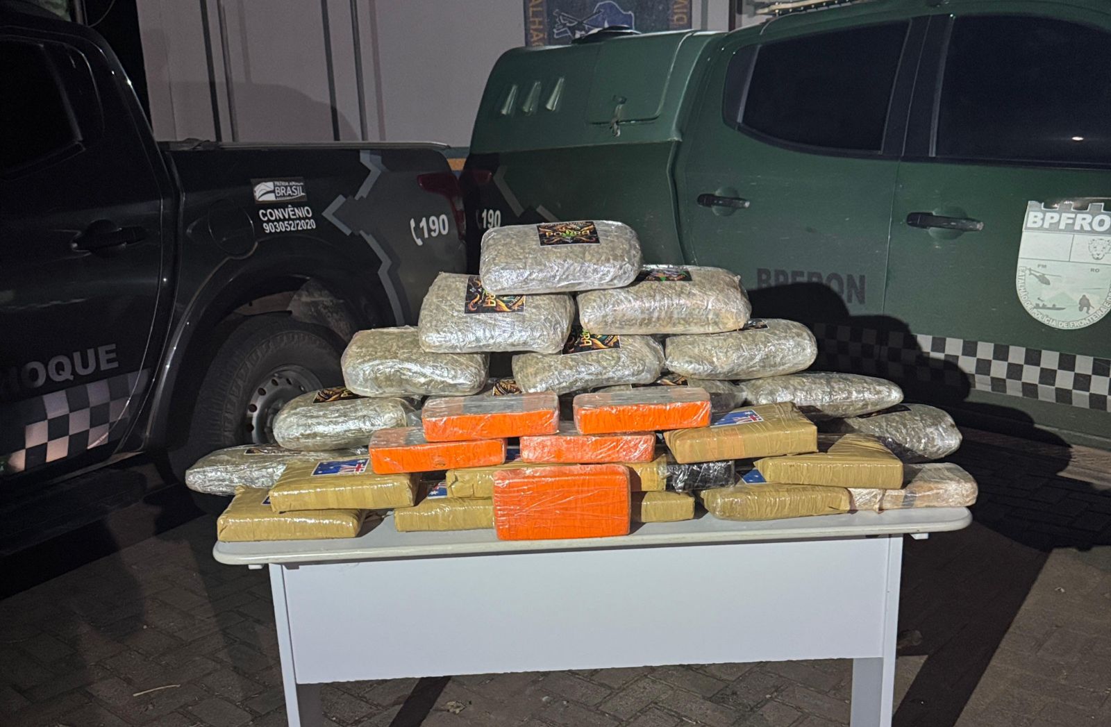 Segundo a PM, após abordagem aos veículos, foram encontrados 04 tijolos de cocaína atrás do banco, e outros 12 escondidos no estepe de um dos veículos, e outros 15 na outra caminhonete.