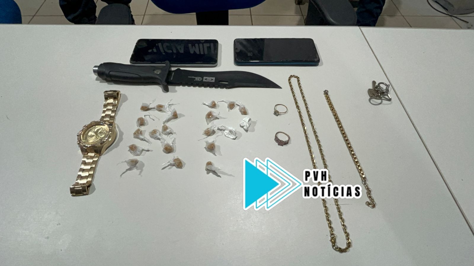 Na revista pessoal foram encontradas com a mulher várias porções de cocaína e crack, sendo ambos detidos. A suspeita depois confessou que comprou os entorpecentes no residencial Orgulho do Madeira por R$50 reais, e revenderia as mesmas.