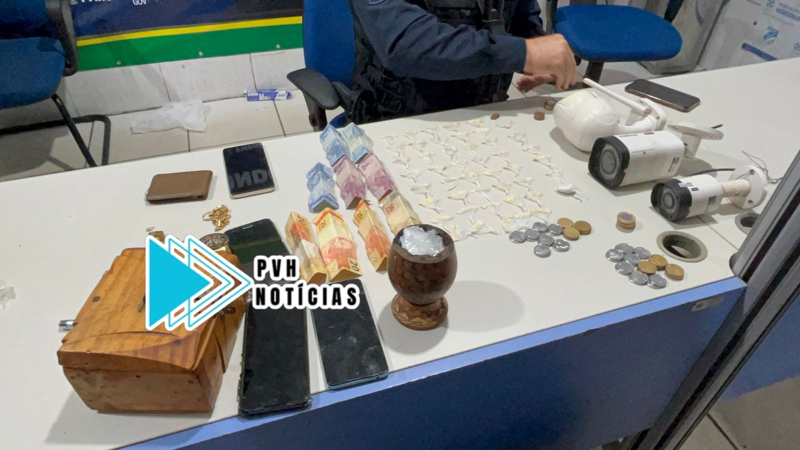 Dentro do local foram apreendidos diversos invólucros de maconha, cocaína e pedras de crack, além de dinheiro e câmeras de monitoramento para acompanhar a movimentação da PM.