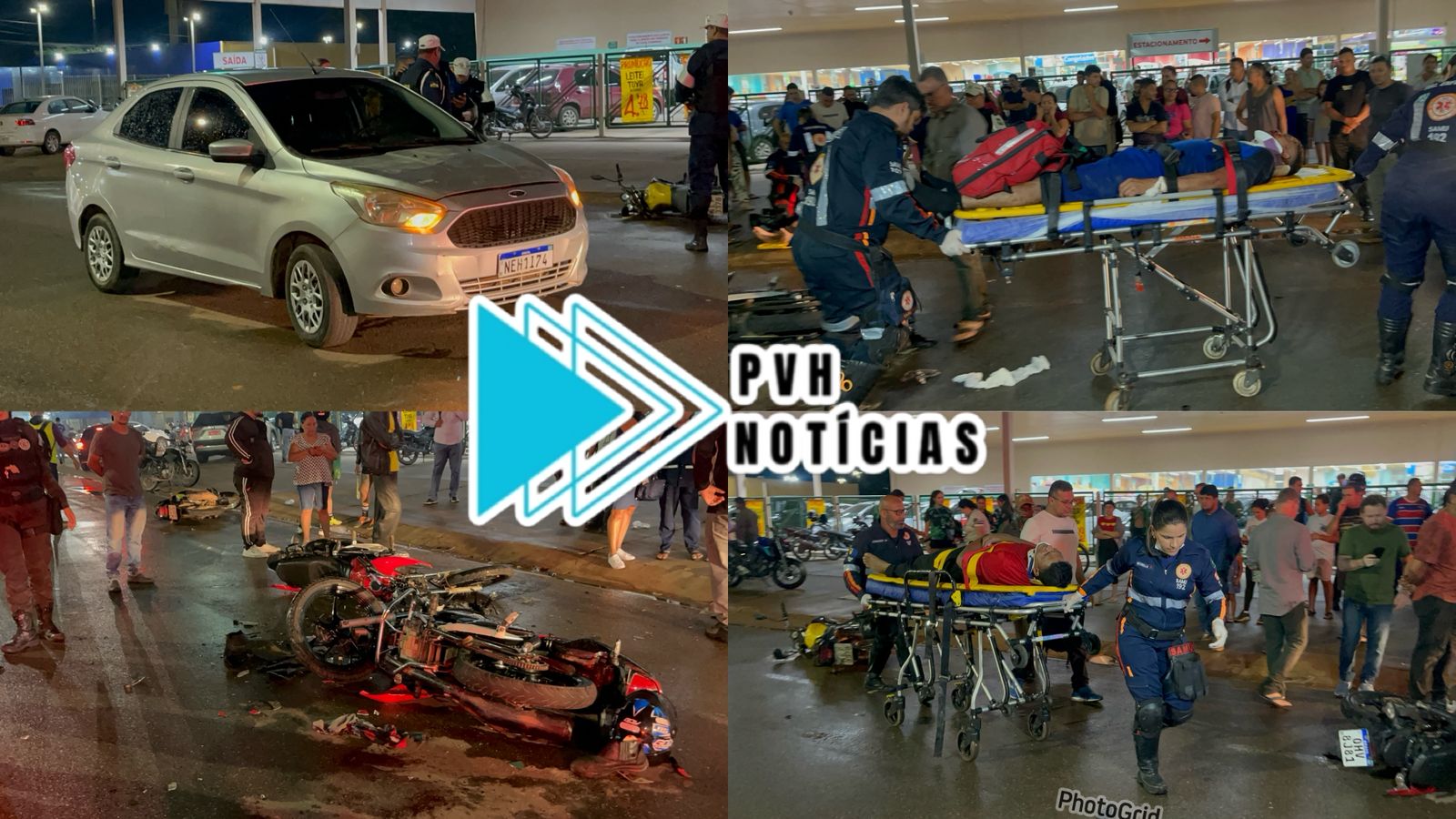 Uma colisão entre três motos e um carro modelo Ford Ka na noite deste sábado (25), deixou três homens em estado grave na Avenida Rio de Janeiro, próximo a Rio Madeira, bairro Lagoa em Porto Velho.