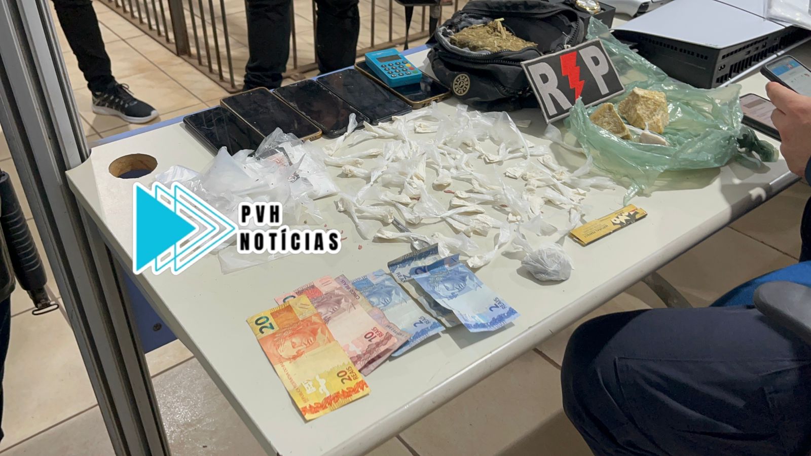 No local foram apreendidas diversas porções de crack, cocaína e tabletes de maconha, além de dinheiro, material de procedência duvidosa e máquina de passar cartão.