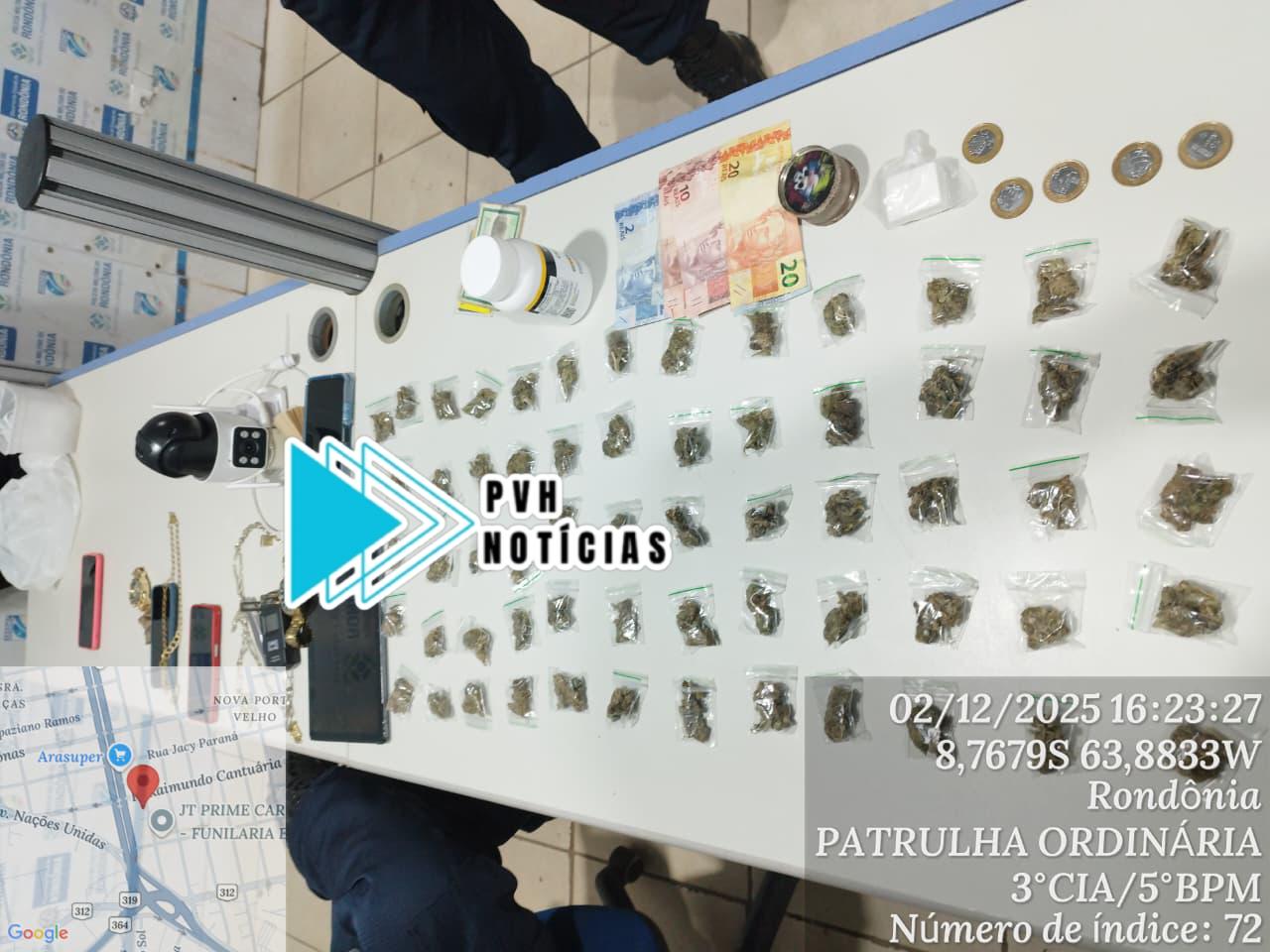 O flagrante aconteceu em uma boca de fumo na Rua Continental, bairro Palheiral, município de Candeias do Jamari.