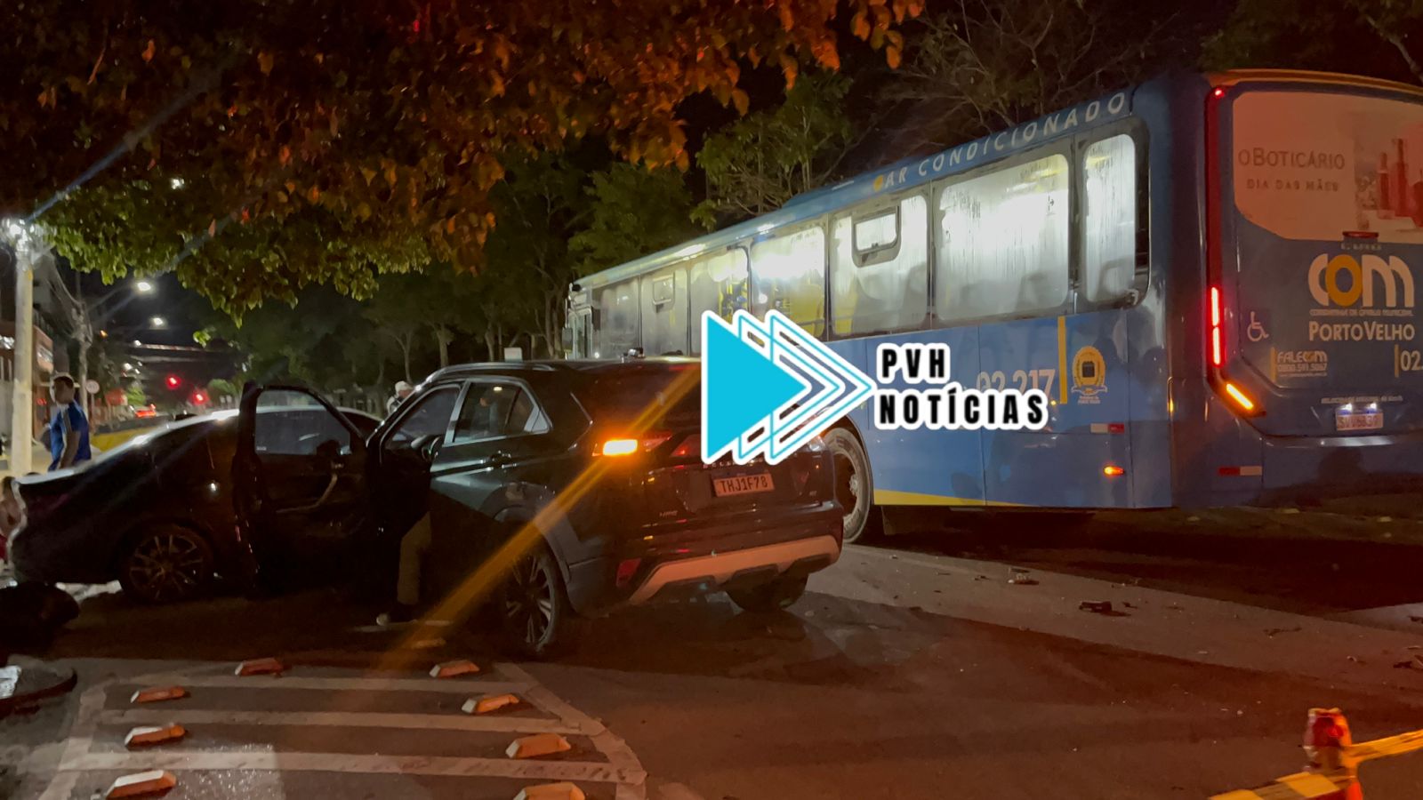 Uma forte colisão entre dois carros e um ônibus na noite desta segunda-feira (05), deixou uma mulher ferida no cruzamento da Avenida Carlos Gomes com Rua Gonçalves Dias, centro de Porto Velho.