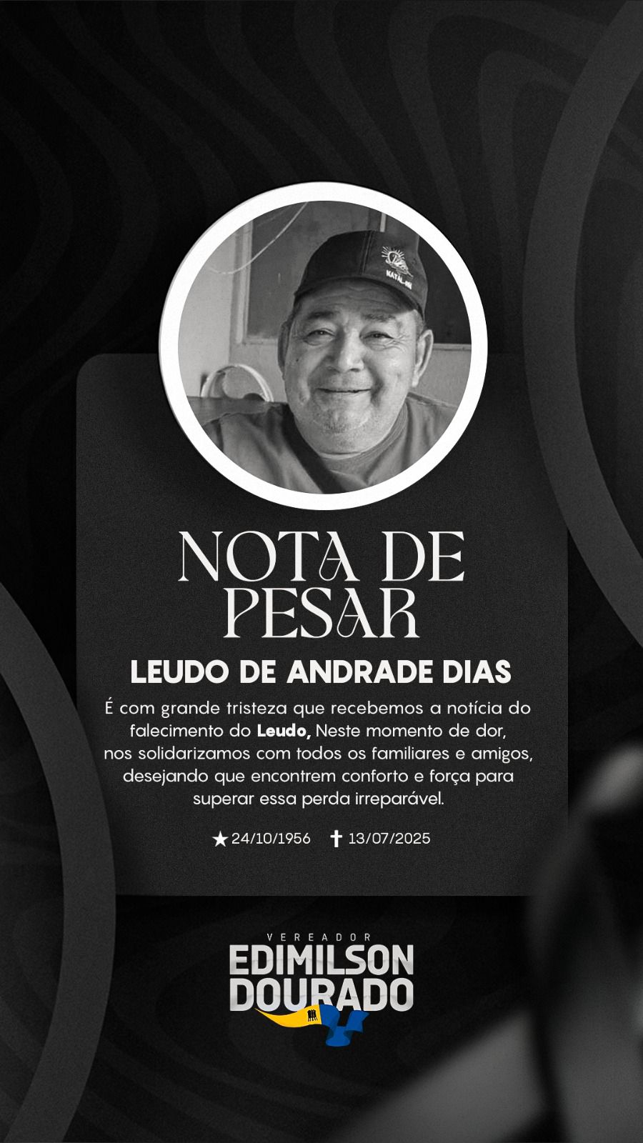 O vereador Edimilson Dourado (União Brasil) emitiu uma nota de pesar pelo falecimento do senhor Leudo de Andrade Dias, de 69 anos, ocorrido neste domingo (13).