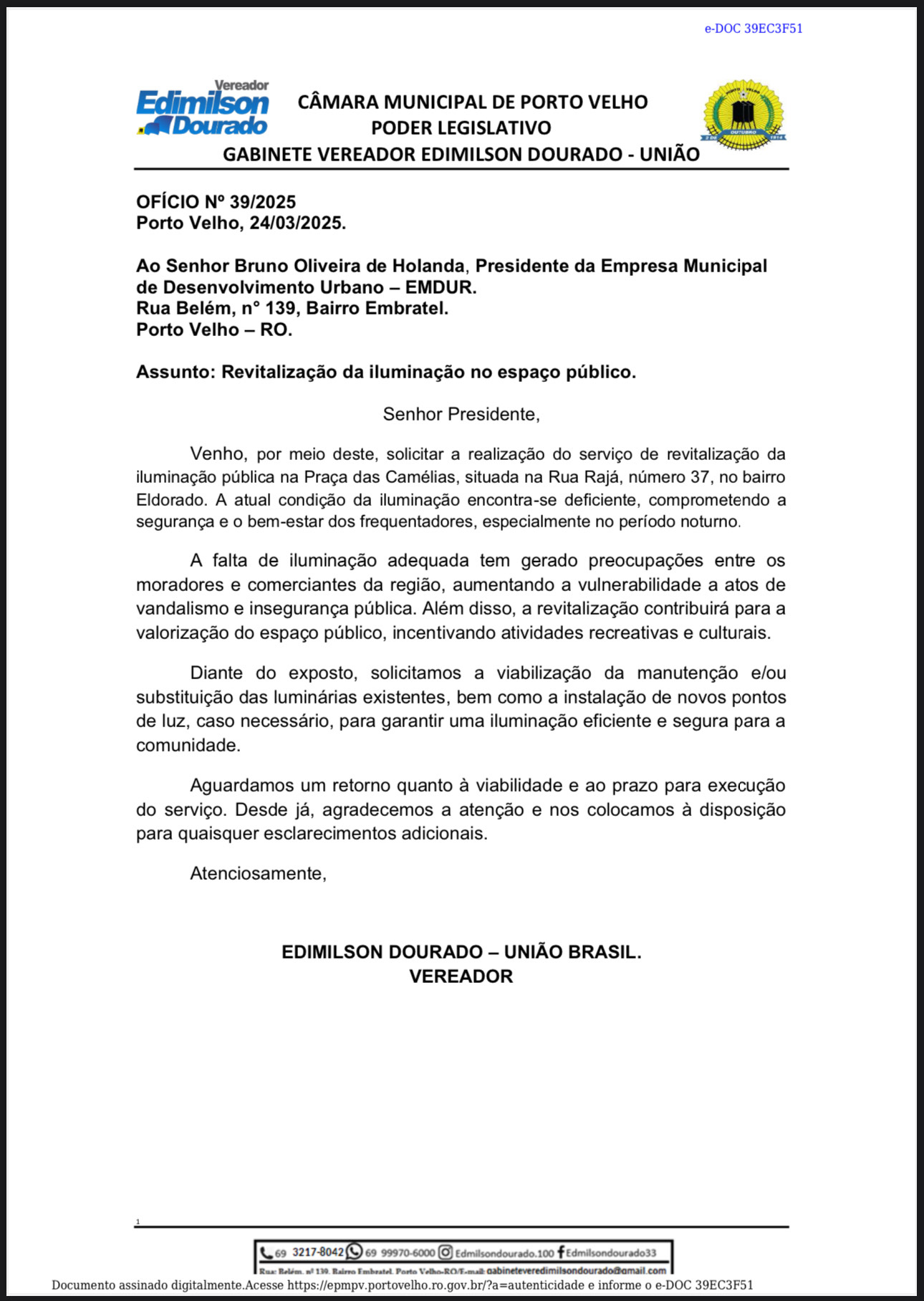 O vereador Edimilson Dourado (União Brasil) encaminhou o Pedido de Providência nº 171/GVED/CMPV/2025 à Empresa Municipal de Desenvolvimento Urbano (Emdur), solicitando a revitalização da iluminação pública da Praça das Camélias, localizada na Rua Rajá, nº 37, no Bairro Eldorado.