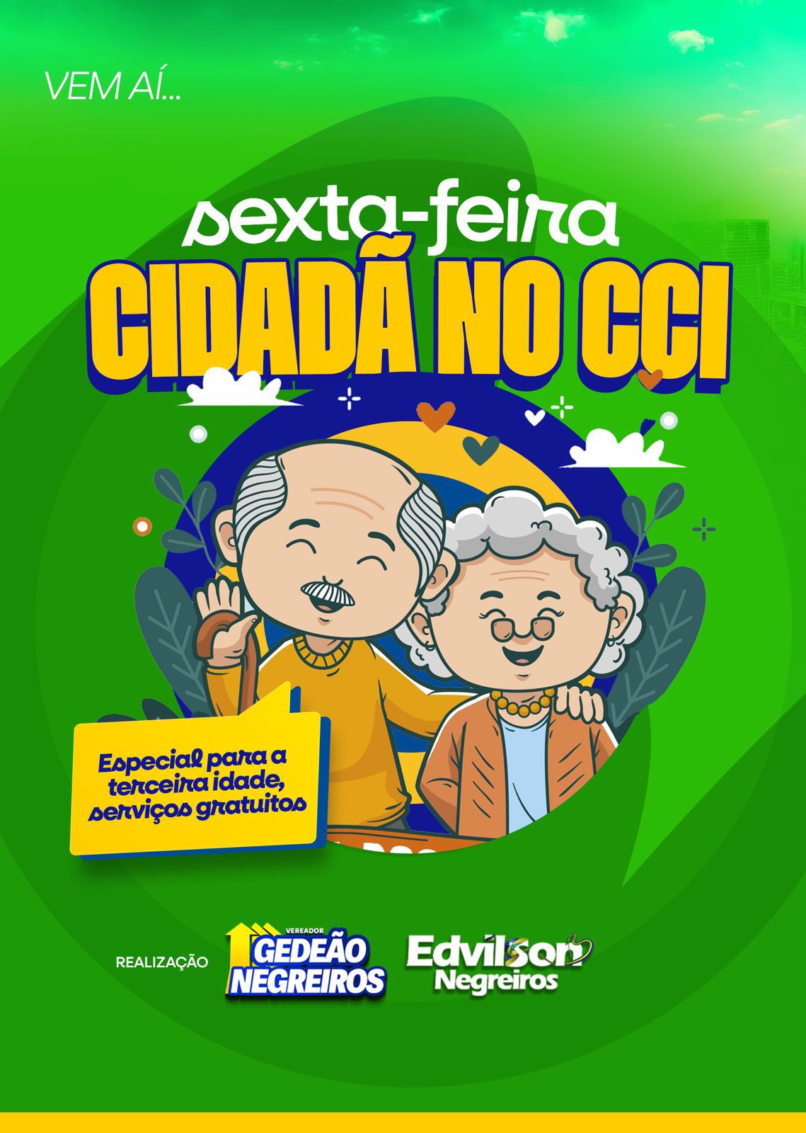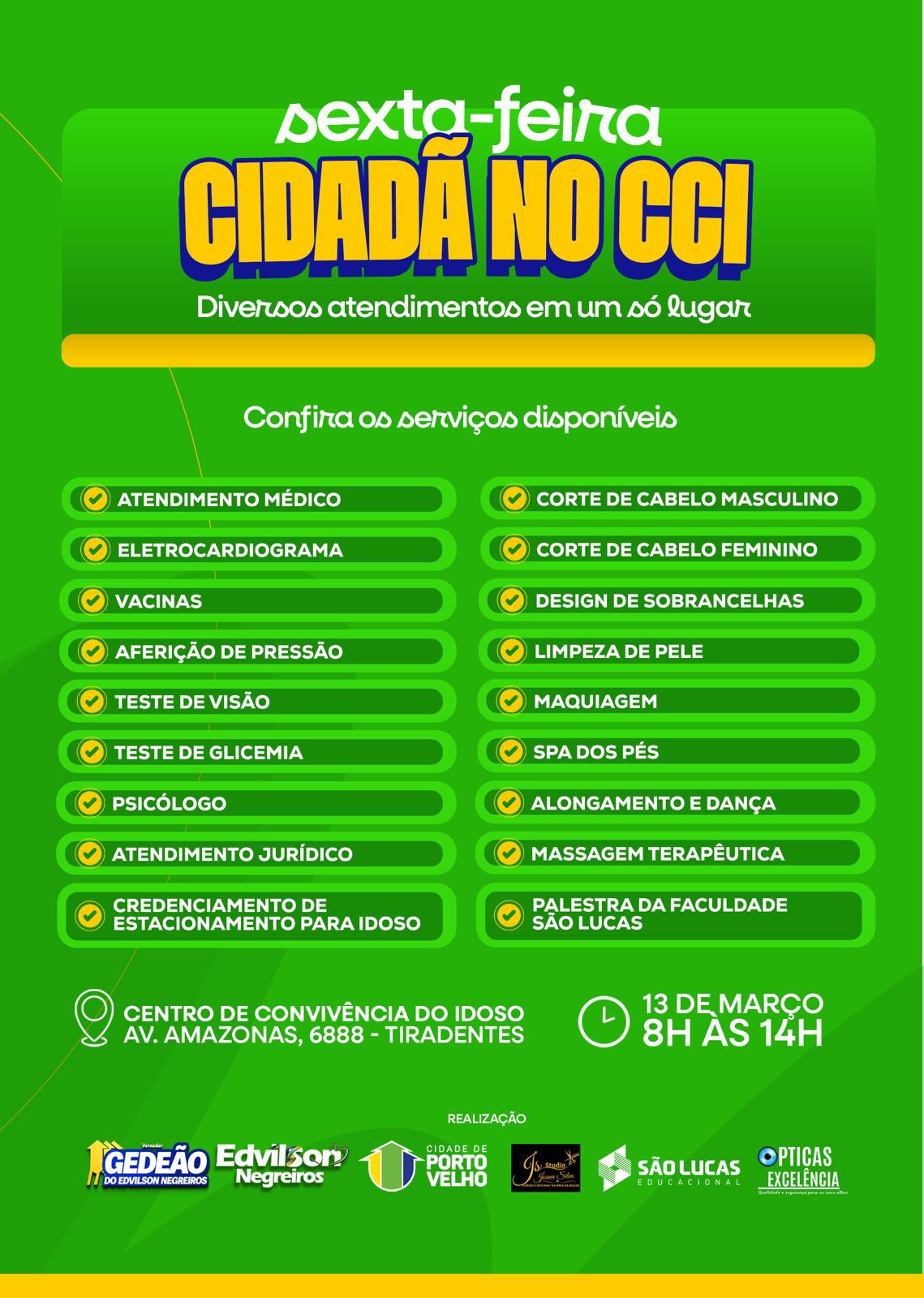 A população da melhor idade de Porto Velho terá uma manhã especial de cuidados e serviços gratuitos durante a ação “Sexta-feira Cidadã no CCI”, iniciativa promovida pelo vereador Gedeão Negreiros. O evento acontecerá no dia 13 de março, das 8h às 14h, no Centro de Convivência do Idoso (CCI), localizado na Avenida Amazonas, nº 6888, bairro Tiradentes.