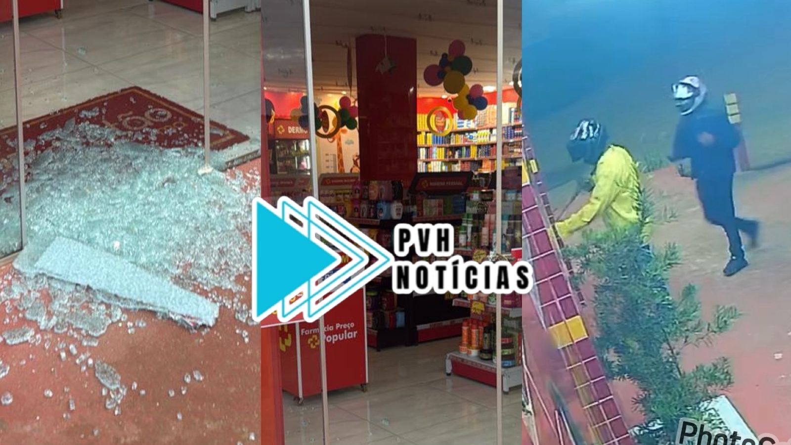 Imagens de câmeras de segurança mostram dois criminosos chegando de moto, depois um deles arromba a porta de vidro enquanto o outro invade a loja.