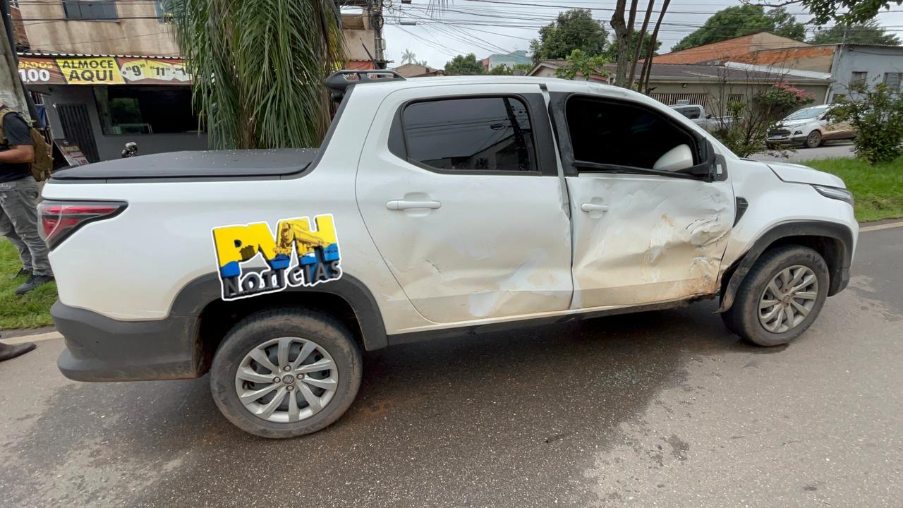 Nas imagens é possível ver quando um casal segue de moto na Rua Prudente de Moraes, quando o Fiat Strada avança o cruzamento, e a moto bate forte na lateral do veículo.