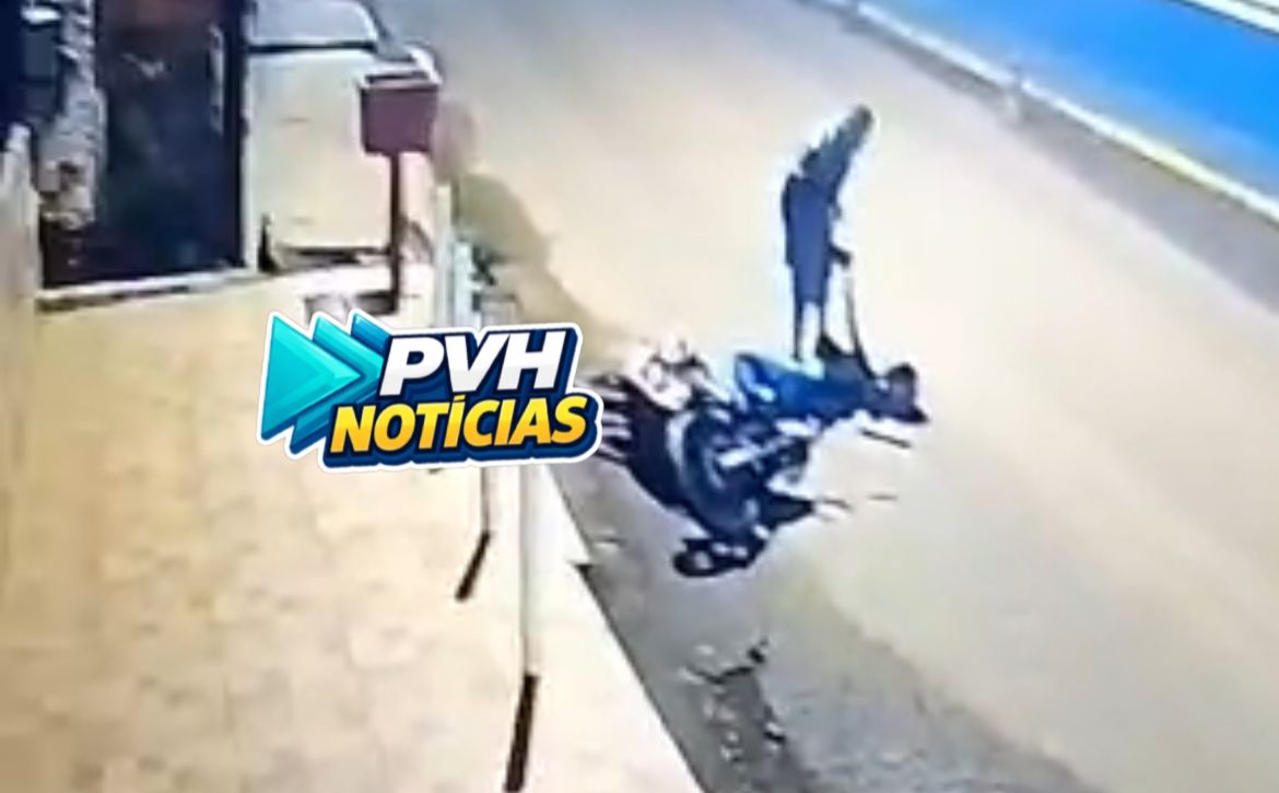 Imagens de uma câmera de segurança mostram quando a mulher que pilotava a moto, aparece caída ao lado do veículo e o passageiro em pé, depois o suspeito agride a vítima com chutes, deixando a mulher desacordada.