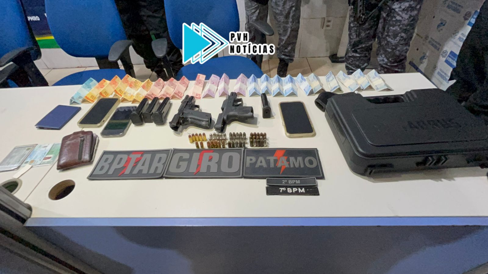 Segundo a PM, as guarnições em patrulhamento pelo bairro Aponiã, avistaram dois carros, um Gol e outro Nissan, parados no final da Rua Antônio Maria Valença, e o momento que Mateus saiu de um veículo e entrou no outro com uma maleta nas mãos.