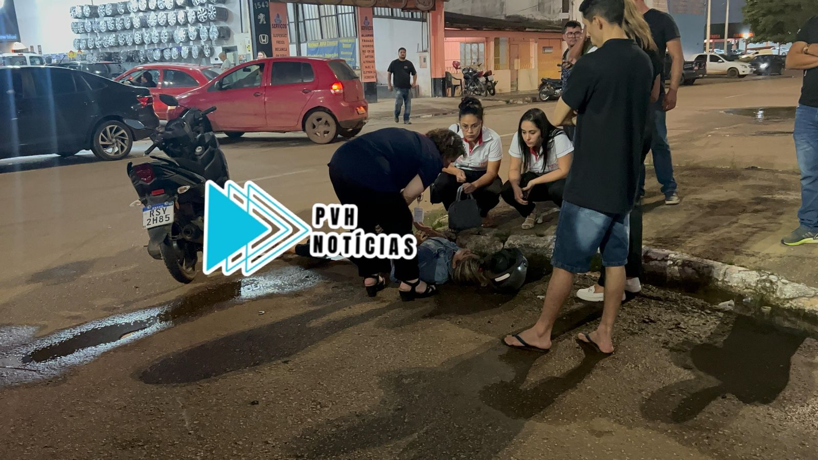 Nas imagens é possível ver quando um carro modelo Gol sai do acostamento e o motorista tenta fazer o retorno na via, e acaba atingindo a moto, derrubando a piloto.