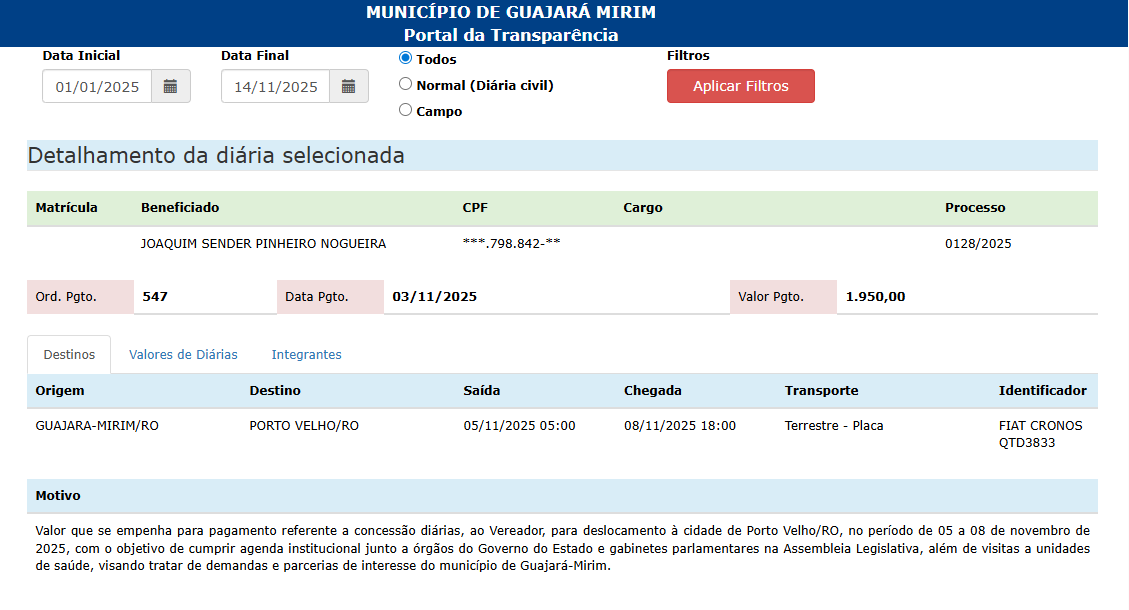 O pagamento consta na Ordem de Pagamento nº 547, de 03 de novembro de 2025, e teve como justificativa oficial justamente o deslocamento “terrestre” em um Fiat Cronos, placa QTD-3833, veículo utilizado para o trajeto entre Guajará-Mirim e Porto Velho.